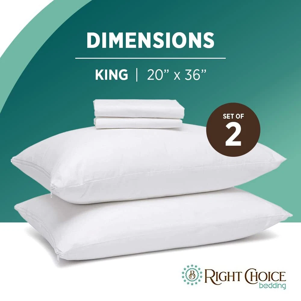 Right Choice Bedding Cotton Pillow Protectors with Zipper are the perfect combination of comfort, protection, and convenience. These pillow protectors are crafted with premium-quality cotton fabric, offering a soft and cozy feel for a peaceful night's sleep. Experience enhanced breathability as the fabric allows air to circulate, keeping your pillows fresh and cool. The convenient zipper closure ensures a secure fit and easy installation, providing reliable protection against spills, stains, and general wear and tear. Upgrade your bedding collection with Right Choice Bedding Cotton Pillow Protectors. NATURAL COTTON FABRIC: Our Right Choice Bedding Cotton Pillow Protectors provide top-quality protection for your bed pillows. Out 100% cotton fabric is soft, smooth, and breathable. ZIPPERED PILLOWCASE FOR FULL COVERAGE: Enjoy complete pillow protection from every angle. Our tight-locking, smooth-gliding zipper will keep your pillow securely in place. PREMIUM 200 THREAD COUNT FABRIC: Experience the luxury of our 200-thread count fabric. It combines durability and softness, enhancing your sleep experience while keeping your pillows in pristine condition. NOISELESS AND COMFORTABLE: Say goodbye to noisy and uncomfortable pillow protectors. Our pillow covers are designed to be noiseless and provide a quiet and restful sleep. EXTEND THE LIFE OF YOUR PILLOWS: Don't let dirt and grime ruin your sleep or the longevity of your pillows. Our zip-up pillow cases act as a protective shield, keeping your pillows clean and fresh, and extending their lifespan for years to come. EASY WASH AND CARE: Our pillow protectors are machine washable, offering hassle-free care. They are designed to withstand multiple washes without shrinking or losing their quality, making caring for them a breeze. KING SIZE 20x36: Our pillow protectors are made to fit king-sized pillows measuring 20x36 inches. Please check your pillow dimensions before purchasing to ensure a proper fit. SET OF 2 FOR CONVENIENCE: Each purchase includes a set of 2 pillow protectors, offering great value and convenience.