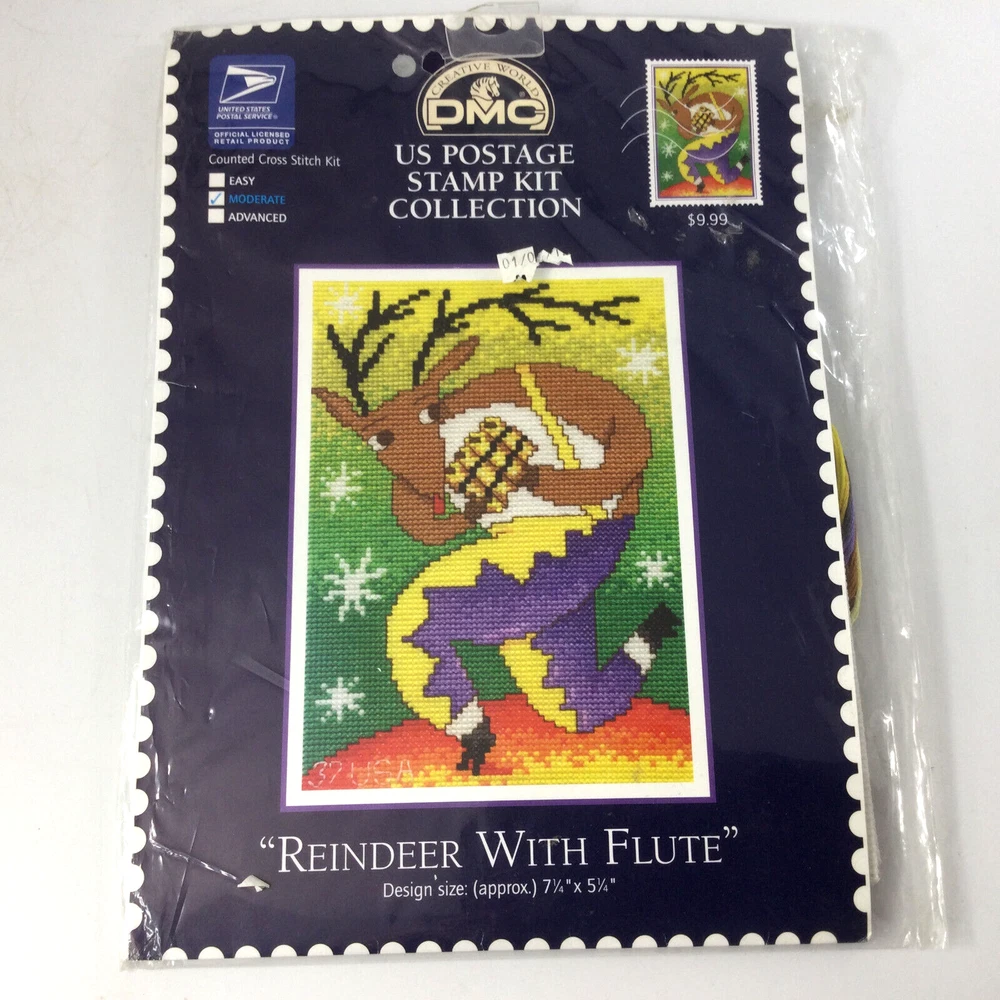 Counted Cross Stitch US Postage Stamp Kit Collection Reindeer with Flute 7 1/4" x 5 1/4". InvN/GS/1