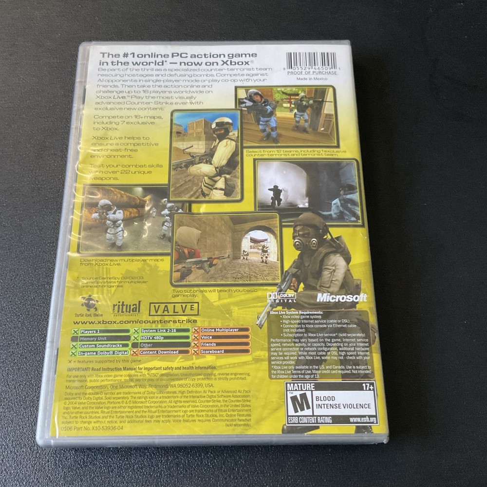 Game Name:Counter-StrikePlatform:Microsoft XboxVideo Game Series:Counter-Strike SeriesRelease Year:2003UPC:0805529465091Estado del artículo:BuenoMPN:0805529493698Country of Origin:Estados UnidosFeatures:Manual IncludedRegion Code:NTSC-U/C (US/Canada)Rating:M - MaturePublisher:MicrosoftGenre:Shootergtin13:0805529465091
