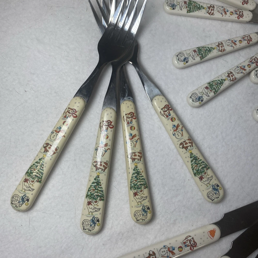 COUNTRY CHRISTMAS Vintage Stainless Steel Plastic Handle Flatware Set Silverware 20 pieces Service for 4 Unique vintage set that is hard to find! See photos for use and condition.