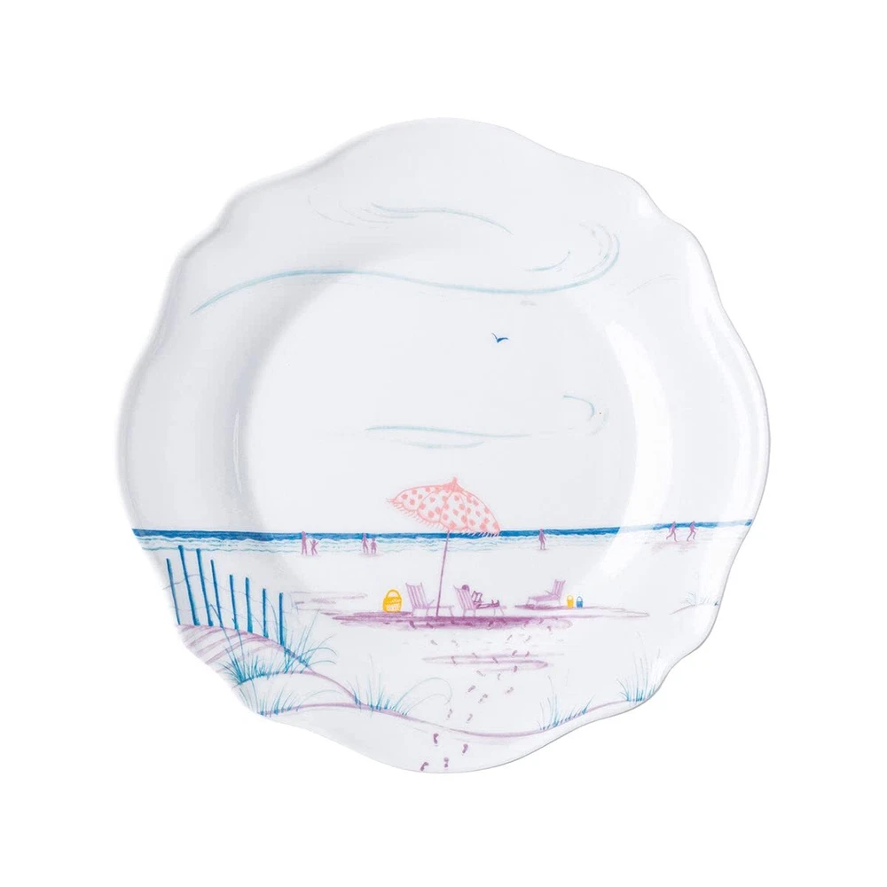 This charming set of 4 scalloped melamine dessert/salad plates features: the pier, a beach umbrella, a sailboat and a lifeguard stand - each beautifully depicted in a calming palette of pastel hues on a durable melamine base. USE AND CARE: Dishwasher safe, top shelf recommended; not oven, microwave or freezer safe. Not suitable for hot contents. Melamine salad plates are BPA free and break-resistant. OUTDOOR DINING: White melamine plates are ideal accompaniment for engagement parties, promotion parties, gatherings with friends, picnics or classy cocktails. Also great for people with ; you won’t have to worry about shattering glass. SOPHISTICATED DESIGN: Embossed pattern around the plate. Made in the China and measures 8.25"W x 0.5"H x 8.25"L. GLASS APPEARANCE: Provides glass like appearance and greater durability. Don’t worry about someone dropping glass and shattering it everywhere. Enjoy the stylish appearance of glass as well as the durability w COMPANY AND QUALITY: As newlyweds and unabashed romantics, Capucine and David Gooding founded in 2001 with a small collection of mouth-blown glassware. Today, produces hundreds of options for your table and home, including an array of charming holiday collections. Discover inspired ways to express the of the season through .