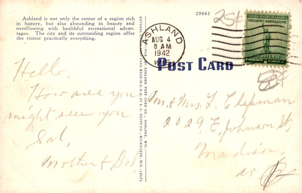 Explore the historical and picturesque city of Ashland, surrounded by beauty and recreational opportunities. A postcard with a message to Ms. L. Chipman from Sal, dated August 4, 1942.