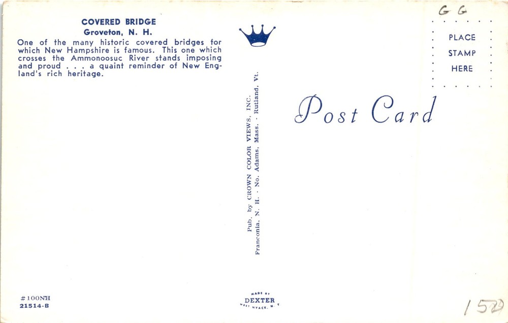 MAKE AN OFFER. THE MORE YOU BUY THE BETTER DEAL I WILL ACCEPT The postcard features a historic covered bridge in Groveton, New Hampshire, which crosses the Ammonoosuc River. New Hampshire is famous for its many covered bridges, which are a reminder of New England's rich heritage. The postcard was published by Crown Color Views, Inc.