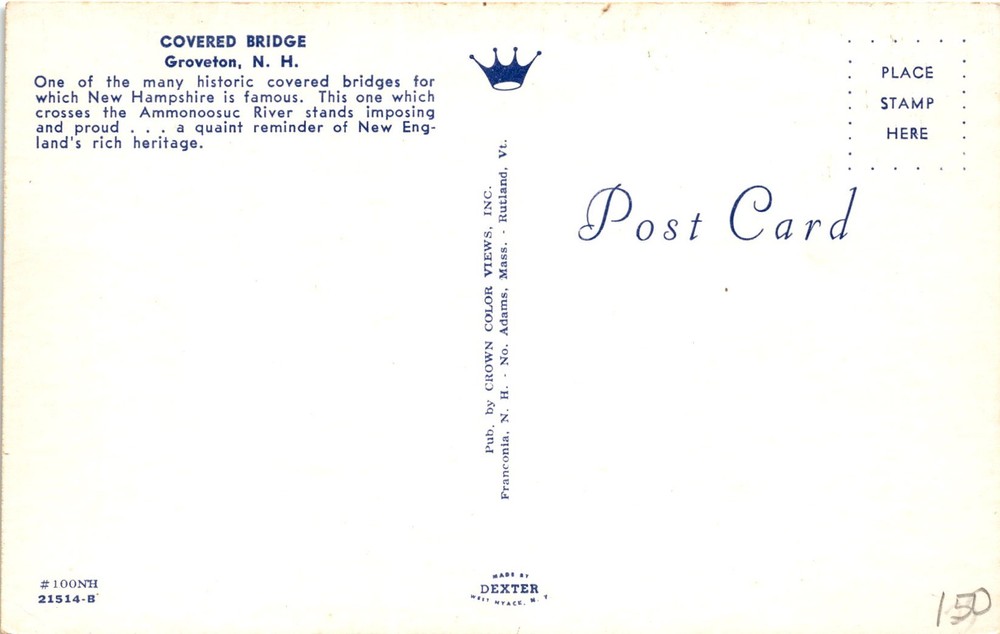 MAKE AN OFFER. THE MORE YOU BUY THE BETTER DEAL I WILL ACCEPT The postcard features an image of a historic covered bridge in Groveton, New Hampshire, which crosses the Ammonoosuc River. Covered bridges are a significant part of New Hampshire's heritage, with many of them still standing as reminders of the state's past.