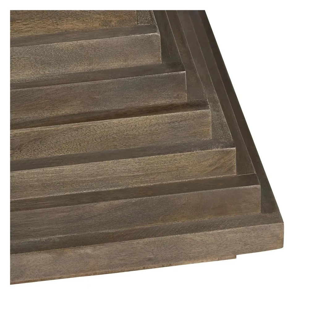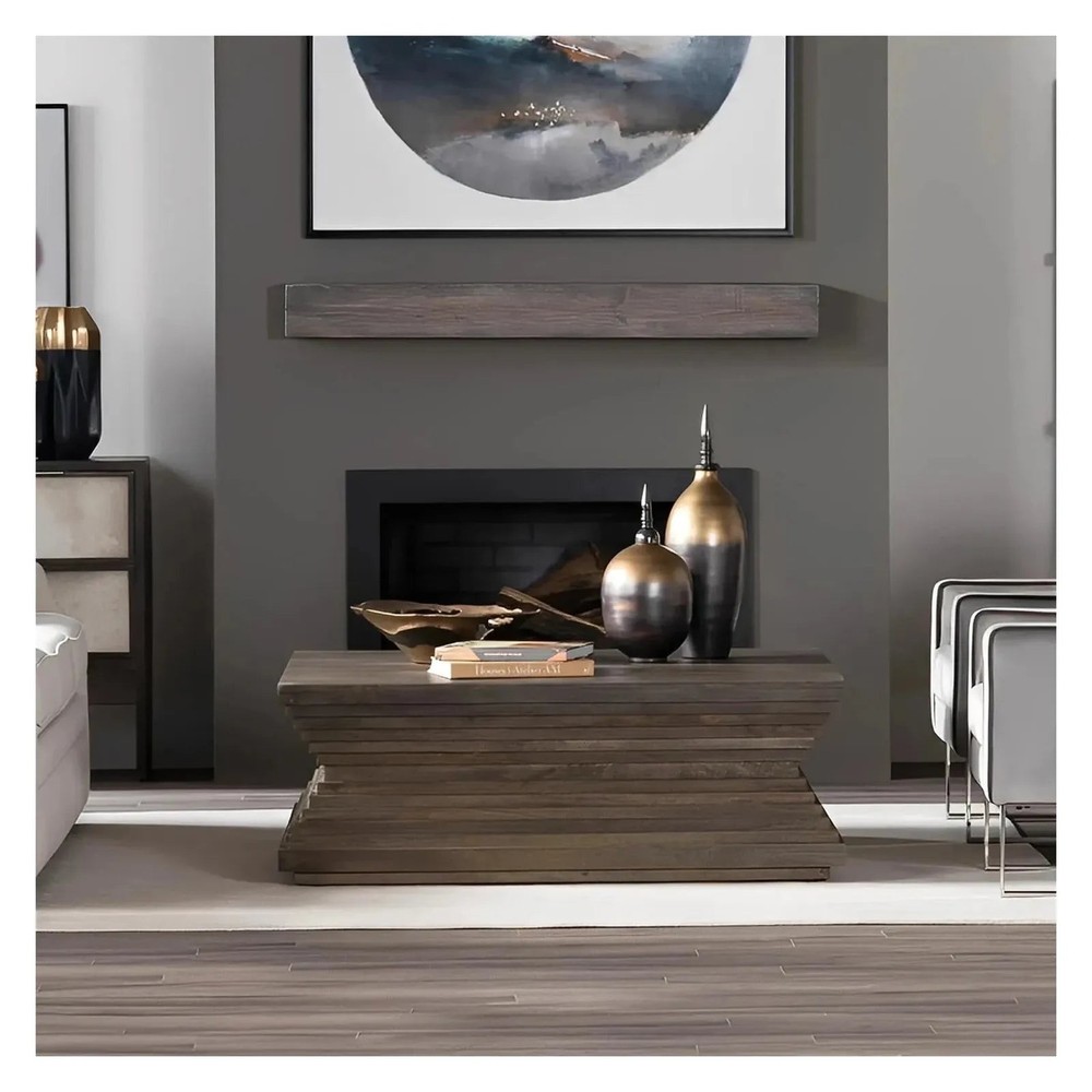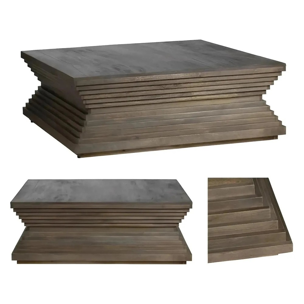 The CV Collection Covington Cocktail or Coffee Table - where form meets function in a striking display of transitional elegance. Crafted from rich brown-stained mango wood, this square table stands as a testament to timeless design. Its distinctive blocky, tiered hourglass shape not only sets it apart but also offers a visually captivating focal point for any living space. Dimensions: 50 x 50 x 17.75 (in)