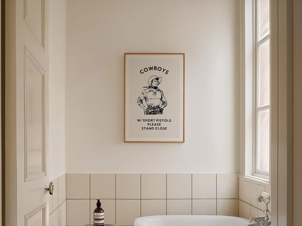 Cowboy Bathroom Print Funny Bathroom Wall Art Bathroom Poster Western Bathroom Humor Art Bathroom Sign Amusing Material: Premium luster photo paper Print type: Inkjet printing One side printed + The finish provides the highest possible resolution and color saturation + Lasts up to 200 years in color and 400 years in black-and-white + Printed on high-quality resin-coated photo base paper medium + Posters can be hung with double-sided tape, tacks, or framed + Hand washing with a gentle cry cloth is recommended for extended durability I will hand select the best choice of paper for your chosen design to ensure top quality results for a beautiful, bright and luxurious print. All prints are sealed in cellophane slips for protection during transportation, and are shipped in a protective cardboard envelope.