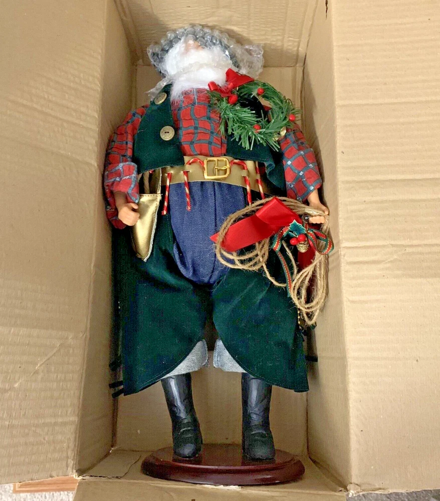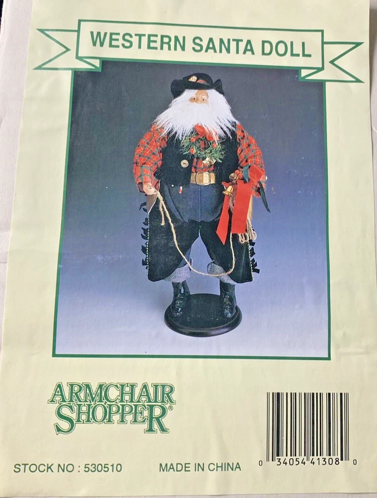 Cowboy Western Santa Doll Wild Wild West Boots Lasso Rope Figurine Doll 19" Candy Canes Holly Wreath Red Denim Blue Old World Christmas Was still in the original box! It's not a big deal, but one foot is a little loose (fyi). Stands roughly 19 inches tall, very large! This is the Western Santa Doll from Armchair Shopper, House of LLoyd, Inc. (Please look carefully since our vintage/antique items are sold "as found" - Please zoom in on photos for a better view of the item's condition. We do our absolute best to research all items we sell. If you ever have questions on a listing, please reach out to me! *We will always package items securely and with care* Thank you for viewing!