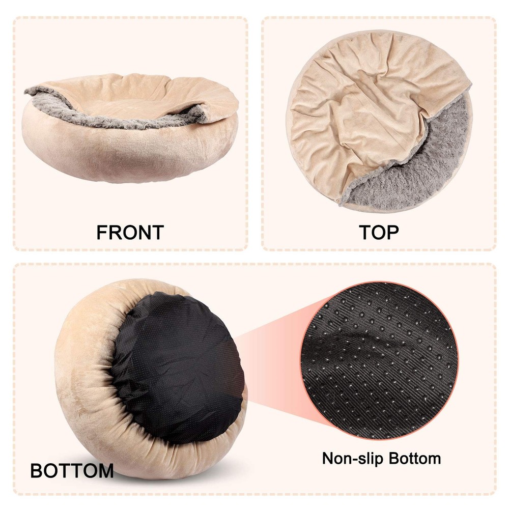 Why Choose GASUR's Pet Bed? 🐶【Raised Rim & Round Shape】: Donut dog bed's stuffed bolsters provide cushioned support and pain relief for your pet, making it one of the most comfortable dog beds for small and elderly dogs. 🐶【Versatility Deep Crevices Design】: Satisfy your pets’ burrowing and nesting instincts, offering them the ultimate pleasure and comfort. 🐶【Non Slide Bottom】: Keep the pet bed in place when pets step in and out. 🐶【Premium Soft and Comfortable】: Soft shag fur nest-like dog bed filled with high-loft, recycled polyester fiber for extremely comfortable sleep with great warmth. 🐶【Machine Washable and Dryer Friendly】: Gentle cycle and tumble dry in low heat. No air dry. 🐶【Portable for Outside Travel】: For pets and pet parents on the go, the pet beds' lightweight polyester fiberfill allows portable convenience. ❤SUPPORTS BETTER SLEEP: Featuring an attached pet blanket, Our dog bed with cover is a must-have for animals that hide or burrow! Along with our soft rose swirl plush fabric interior, the hood provides breathable warmth and creates a sense of security for better sleep, Comfortable dog beds for small dogs. ❤COMFORTABLE DOG BED: The puppy bed interior sleep surface is lined with insulating rose swirl plush fabric, while the hooded blanket exterior features easy-care chamois microsuede; both fabrics are soft-to-touch and serve to suit your pet's desired form of comfort. Suitable for all seasons for your pet snugger on our dog bed. ❤EASY TO CLEAN: Puppy beds for small dogs washable. Pets can present some unique cleaning challenges, so that the entire pet bed is completely machine washable for your convenience. The dog cave bed has designed with a non-slip bottom, which can be easily fixed on the tile and hardwood floor of the home. ❤CHOOSE SIZE: GASUR 2 in 1 covered pet bed comes with an attached blanket hood a donut shape. We suggest the small bed (23x23”) for dogs and cats up to 20lbs, and the medium bed (26x26”) for pets up to 30lbs. ❤WARM TIPS: Vacuum-packed dog bed needs to be left in place for two days after being removed and turn over the entire nest several times to restore the original one!