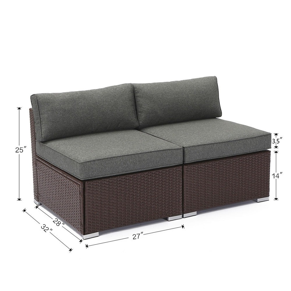 Expand your COSIEST patio sectional set with this set of two extra armless chairs. The modular design makes these chairs easy to add anywhere into your sectional. The plush, four-inch thick cushions provide ample comfort and support.Features: Includes 2 armless chairs and 2 pillows Designed to coordinate with matching patio sectional set Built from rust-resistant powder-coated steel Handwoven in all-weather PE resin wicker 4-inch high-density foam cushions Available with dark-grey or blue poly-fiber cushion covers Modular design Assembly required Each chair supports up to 350 pounds Each chair is 27 inches wide x 32 inches deep x 25 inches high Free Shipping Over $49.99* Details COSIEST 2- Piece Outdoor Sectional Armless Chairs with Pillows Product Description: Expand your COSIEST patio sectional set with this set of two extra armless chairs. The modular design makes these chairs easy to add anywhere into your sectional. The plush, four-inch thick cushions provide ample comfort and support. Features: Includes 2 armless chairs and 2 pillows Designed to coordinate with matching patio sectional set Built from rust-resistant powder-coated steel Handwoven in all-weather PE resin wicker 4-inch high-density foam cushions Available with dark-grey or blue poly-fiber cushion covers Modular design Assembly required Each chair supports up to 350 pounds Each chair is 27 inches wide x 32 inches deep x 25 inches high