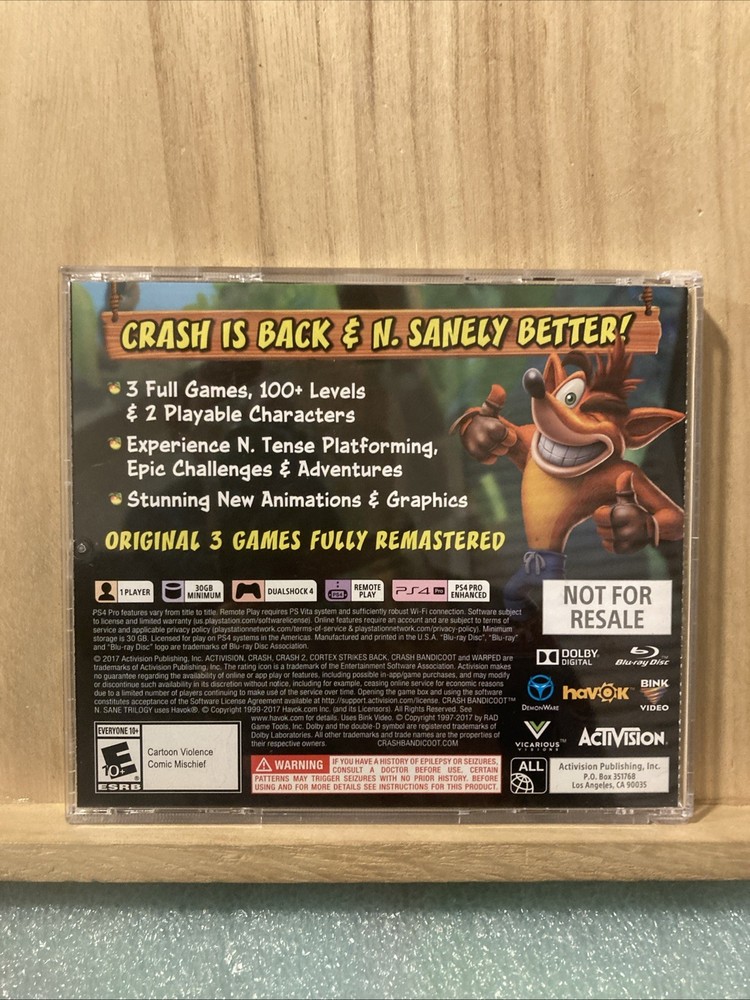 The PS4 Crash Bandicoot N. Sane Trilogy - Ps1 Employee Jewel Case Edition is a video game collection published by Activision Classics for the Sony PlayStation 4 platform. It includes the popular game Crash Bandicoot N. Sane Trilogy, known for its challenging gameplay and colorful graphics. With an E rating for everyone, this edition is sure to bring hours of entertainment to fans of the Crash Bandicoot series. Pre-owned GET YOUR HANDS ON THIS MEMORABILIA BEFORE ANOTHER COLLECTOR DOES ! This was gifted to loyal PlayStation employees and was never available in the retail setting. This particular copy is from an employee who worked for Naughty dog on the “Uncharted” games for ps4. Some very minor cosmetic scuff marks and shelf wear on case. Overall in great condition! ( SEE PICS ) Ships fast Please check out our other listings for similar products like this!
