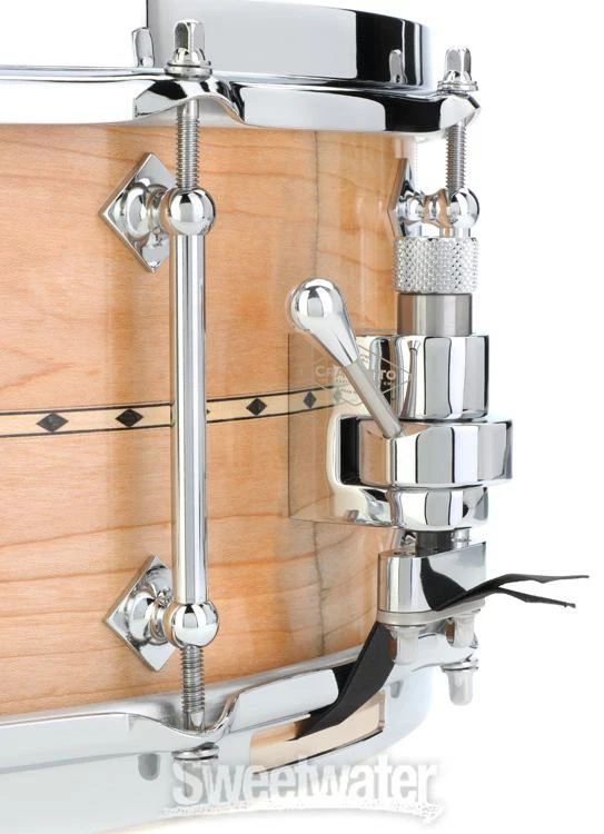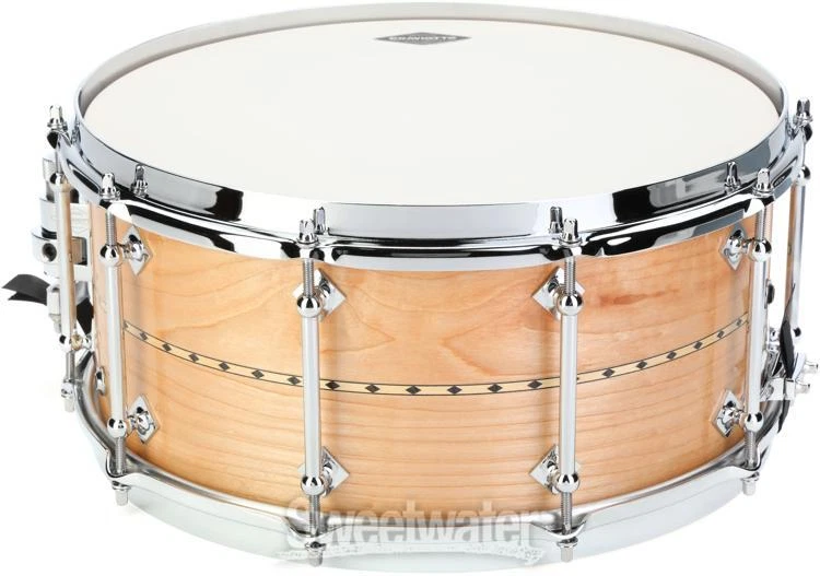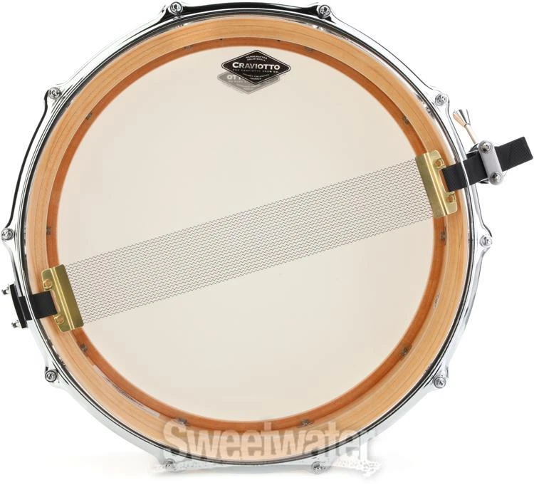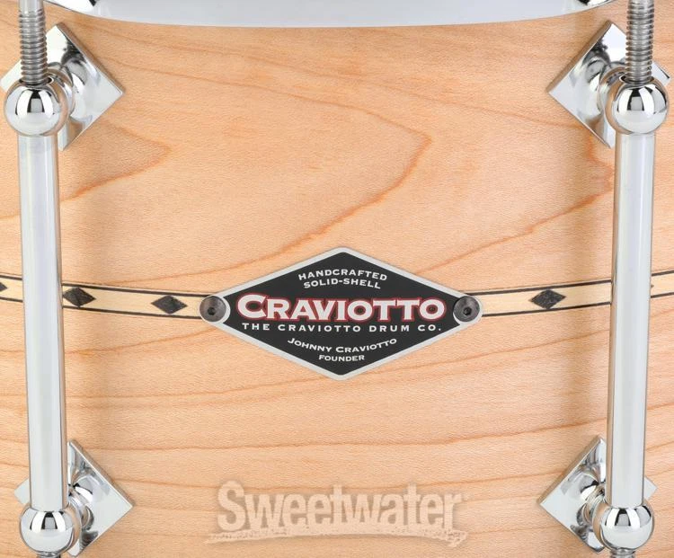 Handcrafted Maple Snare from Craviotto Onstage or in the studio, nothing sounds or plays like a Craviotto. This handcrafted 6.5" x 14" maple snare sports the body, musical depth, sensitivity, and dynamics today's called-upon drummer needs to perform their best. Its fine maple shell begins life as a single piece of select maple, widely regarded for its full-range projection and timeless beauty, steam bent into place by Johnny Craviotto's crack team of shell artisans. The 1-piece design gives this snare unbeatable strength, roundness, intonation, and resonance. Its 45° bearing edges maximize head response, and 2.3mm triple-flanged hoops endow this snare with a classically fat, open attack.Solid, 1-piece maple shell Even the best plywood shell can lose resonance due to added glue weight and poor contact between plies. That's why this Craviotto snare is built from a single piece of hand-selected premium maple, steam bent into place, for a look and Sweetwater is an Authorized Craviotto Dealer Genuine New Item Sweetwater's 2-year warranty Craviotto Maple Snare Drum - 6.5 inch x 14 inch, Natural with Maple Inlay 6.5" x 14" Maple Snare Drum with 2.3mm Triple-flanged Hoops - Natural with Maple Inlay Handcrafted Maple Snare from Craviotto Onstage or in the studio, nothing sounds or plays like a Craviotto. This handcrafted 6.5" x 14" maple snare sports the body, musical depth, sensitivity, and dynamics today's called-upon drummer needs to perform their best. Its fine maple shell begins life as a single piece of select maple, widely regarded for its full-range projection and timeless beauty, steam bent into place by Johnny Craviotto's crack team of shell artisans. The 1-piece design gives this snare unbeatable strength, roundness, intonation, and resonance. Its 45° bearing edges maximize head response, and 2.3mm triple-flanged hoops endow this snare with a classically fat, open attack. Solid, 1-piece maple shell Even the best plywood shell can lose resonance due to added glue weight and poor contact between plies. That's why this Craviotto snare is built from a single piece of hand-selected premium maple, steam bent into place, for a look and sound that will call you back throughout your career. If you're in the market for a handcrafted maple snare, don't pass up this one-of-a-kind Craviotto — order yours from Sweetwater today. Modern 45° bearing edges The 45° bearing edges on this Craviotto snare offer pinpoint head contact, allowing both the batter and snare-side heads to resonate to their full potential. Craviotto's 45°, 30°, and Baseball Bat bearing edges (L–R) on 1-piece maple shells Craviotto 14" Maple Snare Drum Features: Size: 6.5" x 14" Handbuilt from a single piece of steam-bent maple Unmatched strength, roundness, intonation, and resonance Wide tuning range Modern 45° bearing edges maximize head response 2.3mm triple-flanged hoops deliver a fat, open attack Specification Detail Type Snare Drum Depth 6.5" Drum Diameter 14" Shell Material Maple, Maple Inlay Shell Construction 1-ply, Steam-bent Hoops 2.3mm Double-flanged Steel Lugs 10 x Tube Lugs Color Natural Finish Chrome-plated Hardware Heads Aquarian RETURN INFORMATION We want you to be completely happy with your purchase from Sweetwater. If you are not satisfied with your product, you may return it for a refund of the purchase price within 30 days. If your purchase was eligible for Free Shipping, the shipping cost will be deducted from your credit or refund. Returns must be in the complete and original packaging with all accessories and complete documentation (Owner's Manual, warranty card, quick start guides, etc.), show no signs of wear or use, and include a Return Authorization number or be subject to a restocking fee.