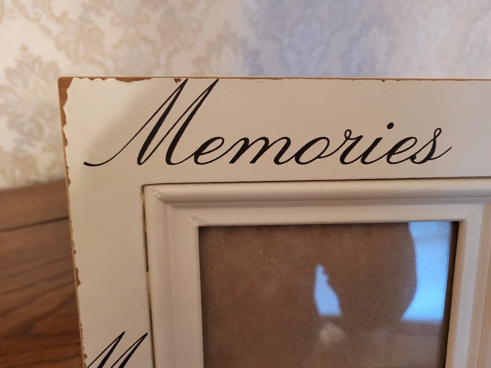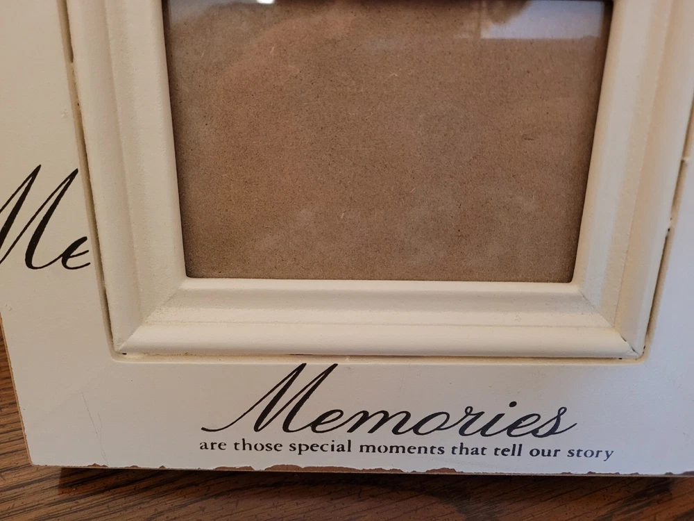 Great condition..MEMORIES. .. Are those special moments that tell our story. Distressed cream color wood..holds 3x5 photo...frame is 8.5"x8"..