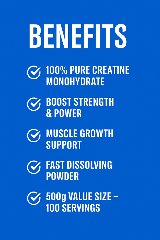 are your training seriously with Creavance Creatine Monohydrate , developed for athletes and fitness enthusiasts who demand consistency, purity, and performance . Our creatine is 100% pure and micronized , ensuring easy mixing and optimal absorption. Designed to support high-intensity workouts, strength training, and daily performance routines, it fits perfectly into any serious supplementation plan. Whether you train for strength, endurance, or overall performance, Creavance delivers a clean, reliable product you can trust — with fast shipping across the United States. KEY FEATURES ✔ 100% Pure Creatine Monohydrate ✔ Micronized powder for better mixability ✔ Unflavored – easy to stack with any supplement ✔ Ideal for strength and performance training ✔ Sealed, high-quality packaging ✔ Fast shipping within the USA DIRECTIONS FOR USE Mix 1 scoop (5g) with water or your favorite beverage. Use daily or as recommended by a health professional. 🔹 PRODUCT DETAILS Net Weight: 500g Form: Powder Flavor: Unflavored Condition: Brand New Ships From: United States WHY CHOOSE CREAVANCE Creavance Nutrition focuses on quality, transparency, and reliability . Every product is crafted to meet high standards, giving you confidence in what you put into your body. Train smarter. Stay consistent. Choose Creavance.