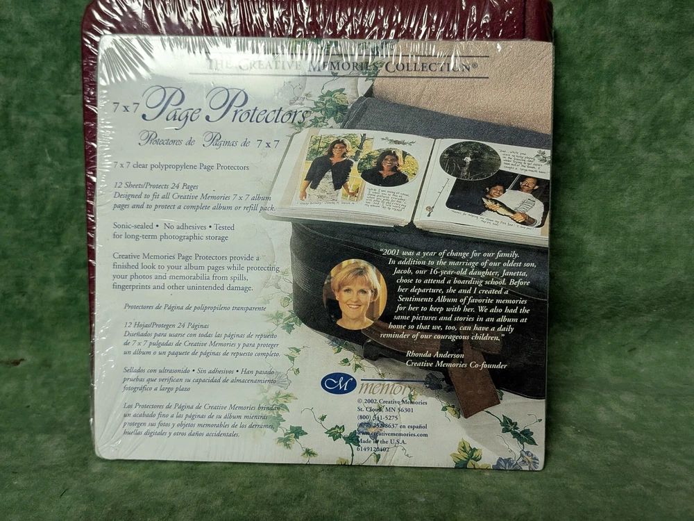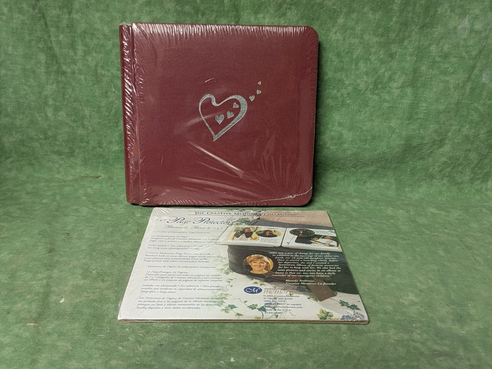 Great starter set! Creative Memories 7" x 7" album still in the original plastic wrap and never opened. Hard to find redheart embossed on the front. Also included is an unopened pack of page protectors. Mumbo Jumbo: all sales are final. No refunds or returns. All items are shipped insured. Should by some chance an item is broken in shipping, buyer will need to file a damage claim or repair claim with the post office. Insurance is purchased for that reason. Although breakage isn't anticipated, it can happen as I can't control the handling of items once in the possession of the post office. I do try to pack to ensure a safe delivery.