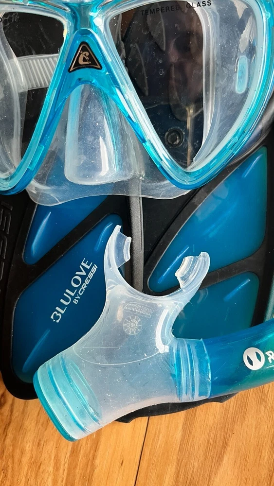 Experience the clear blue waters with the Cressi Adult Snorkel Set, featuring the BlueLove Dry Snorkel. Designed for comfort and ease of use, this set was used ONCE and is perfect for both novice and experienced snorkelers. The BlueLove Dry Snorkel is crafted to effectively separate surface spills from your airway, ensuring a dry and pleasant snorkeling session.Cressi's commitment to quality is evident in every piece of equipment, and this set is no exception. With its durable construction and ergonomic design, the Cressi Adult Snorkel Set offers reliability and performance for all your underwater adventures. Snorkeling has never been more enjoyable or accessible. See the companion set in PINK at: https://www.ebay.com/itm/405357914215