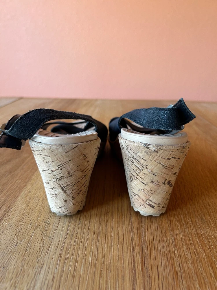 Crocs A-Leigh Womens 8 Leather Cork Wedge Heel Slingback Peep Toe Sandal Black