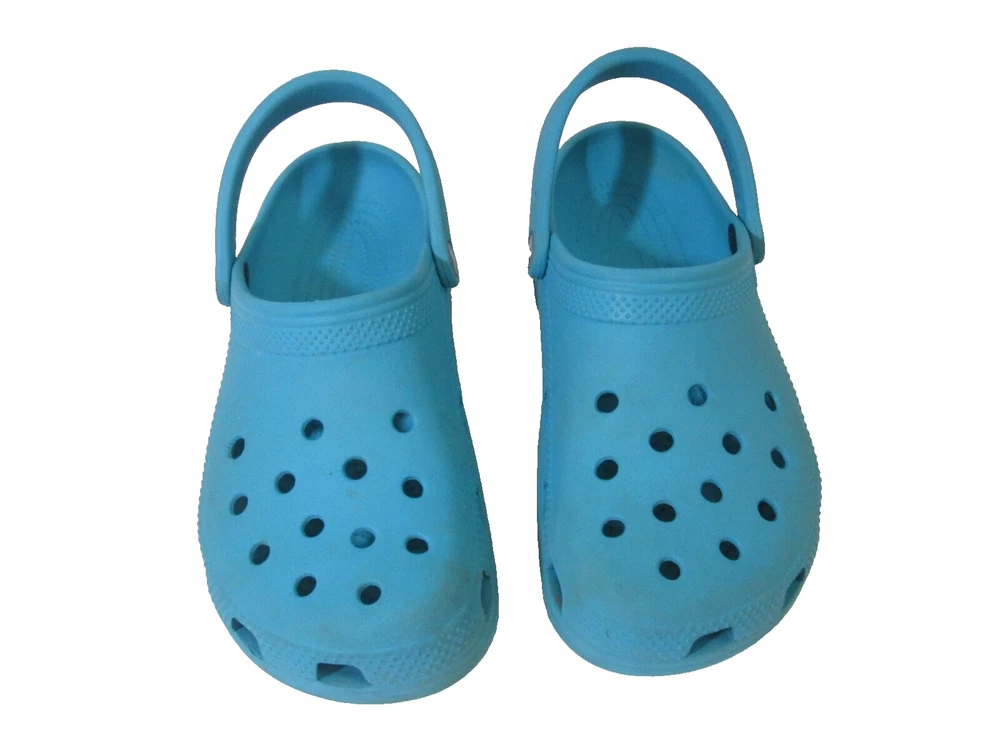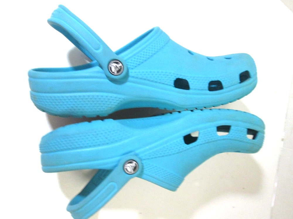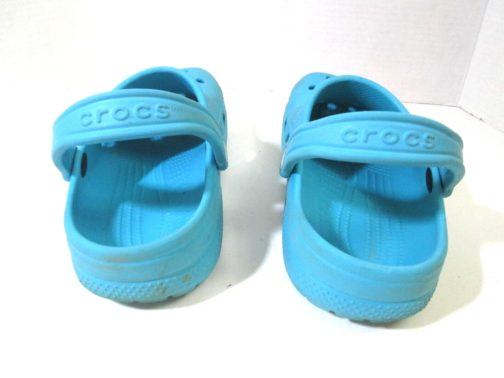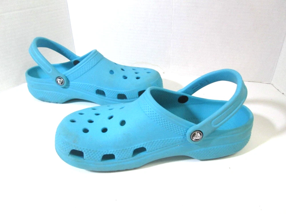 Introducing these stylish Crocs Aqua Clogs, perfect for any casual occasion. These slip-on clogs feature a solid pattern, round toe shape, and a flat heel style. The upper material is made of durable rubber with a synthetic lining material and insole material. The outsole material is also rubber, providing a comfortable and breathable experience for the feet. These clogs come in a beautiful aqua color with a logo accent and are available in women's size 9 and men's size 7. They are part of the Comfort Slide product line and are perfect for summer, fall, and spring seasons. Get your hands on these stylish and comfortable Crocs Aqua Clogs today!