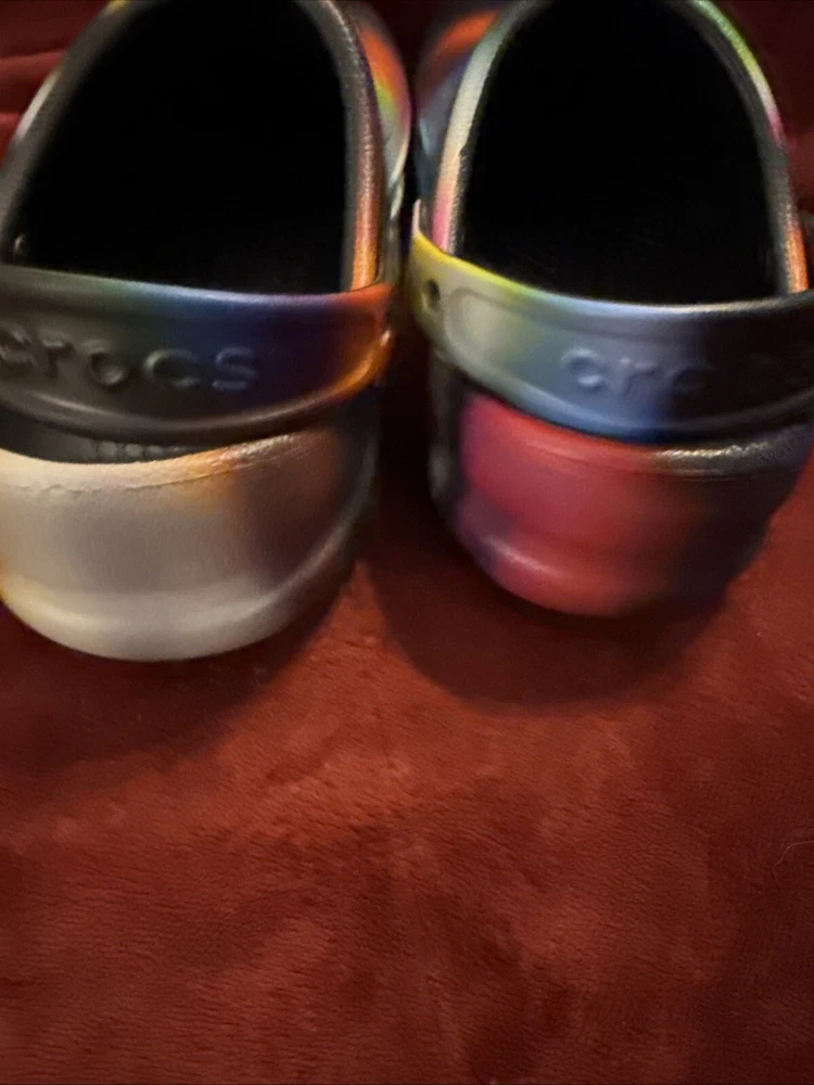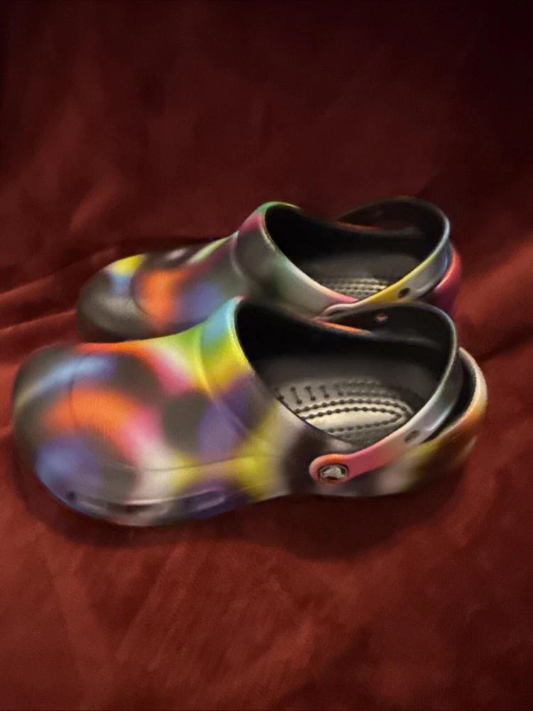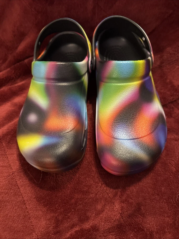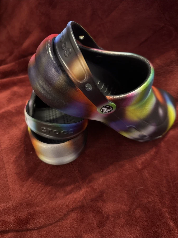 The product is a pair of Crocs Bistro Clogs designed for unisex adults, with a slip-on style and featuring the Croc's Lock slip-resistant tread. These colorful clogs are in a multicolor design, suitable for both men and women with a US shoe size of 10 for women and 8 for men. The shoes are made of synthetic material and are ideal for casual wear, specifically created to provide comfort and safety in work environments like kitchens or restaurants.