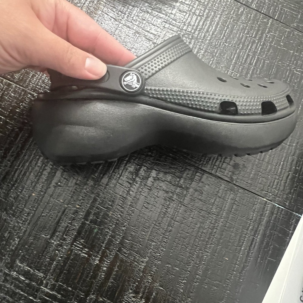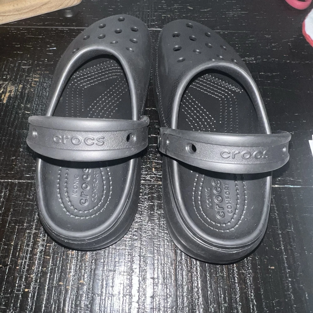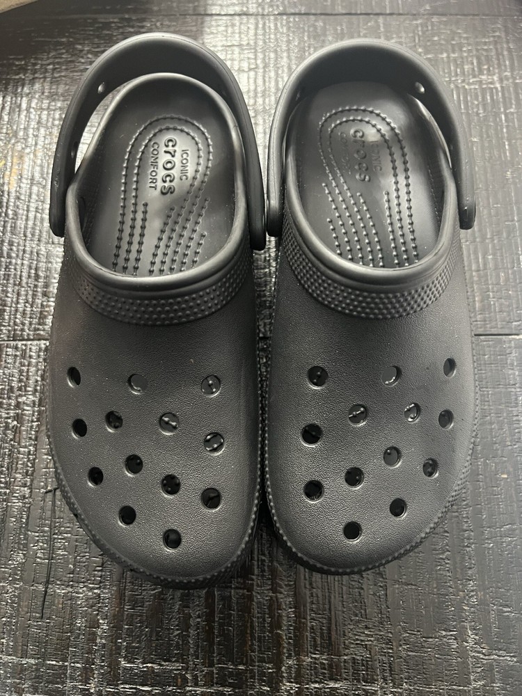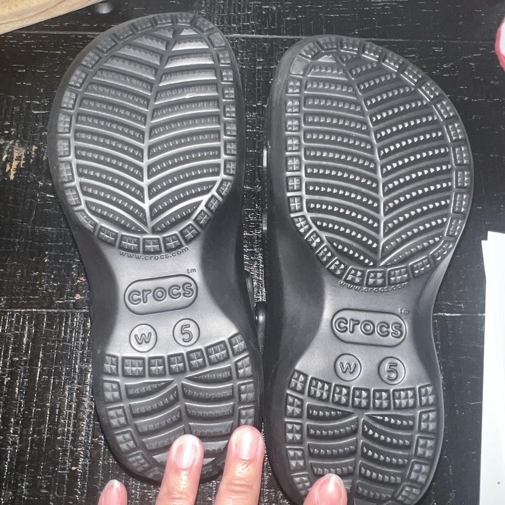 Crocs Classic Bae Women's Black Slip On Clogs in size 5 feature a chunky platform design for added height. These casual clogs are made of breathable rubber material, ensuring comfort for all-day wear. With a slip-on style and classic black color, these Crocs are perfect for women looking for both style and functionality in their footwear.
