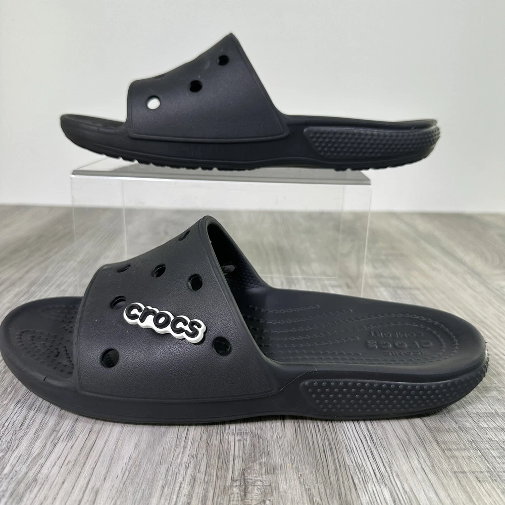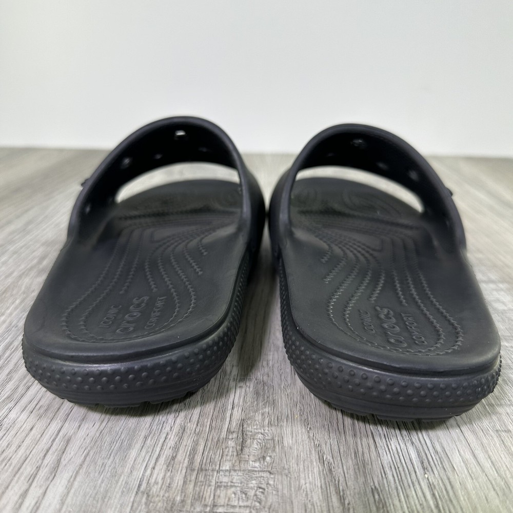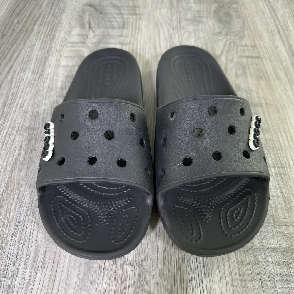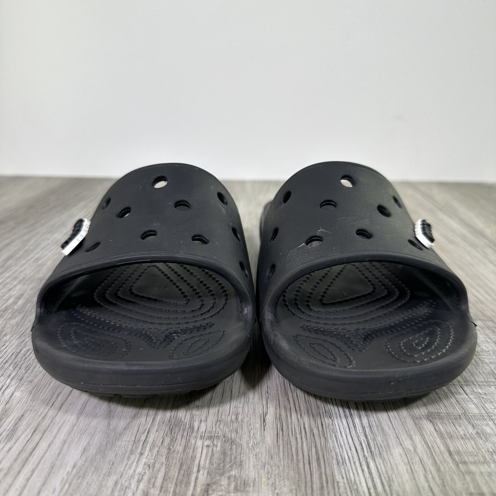 Crocs Classic Black Slides Mens 7 Womens 9 Slip On Sandals Shoes Beach Water. In used condition please see pictures for details. Little wear very nice condition.