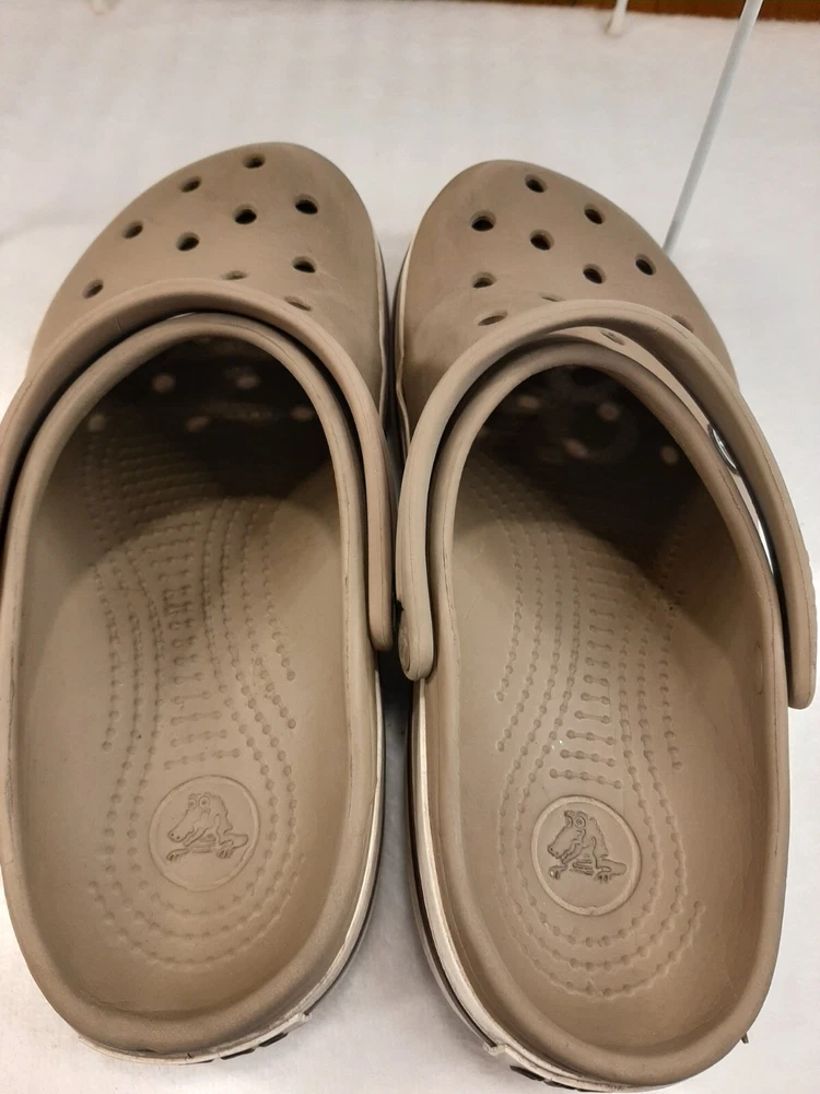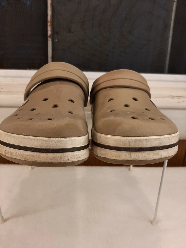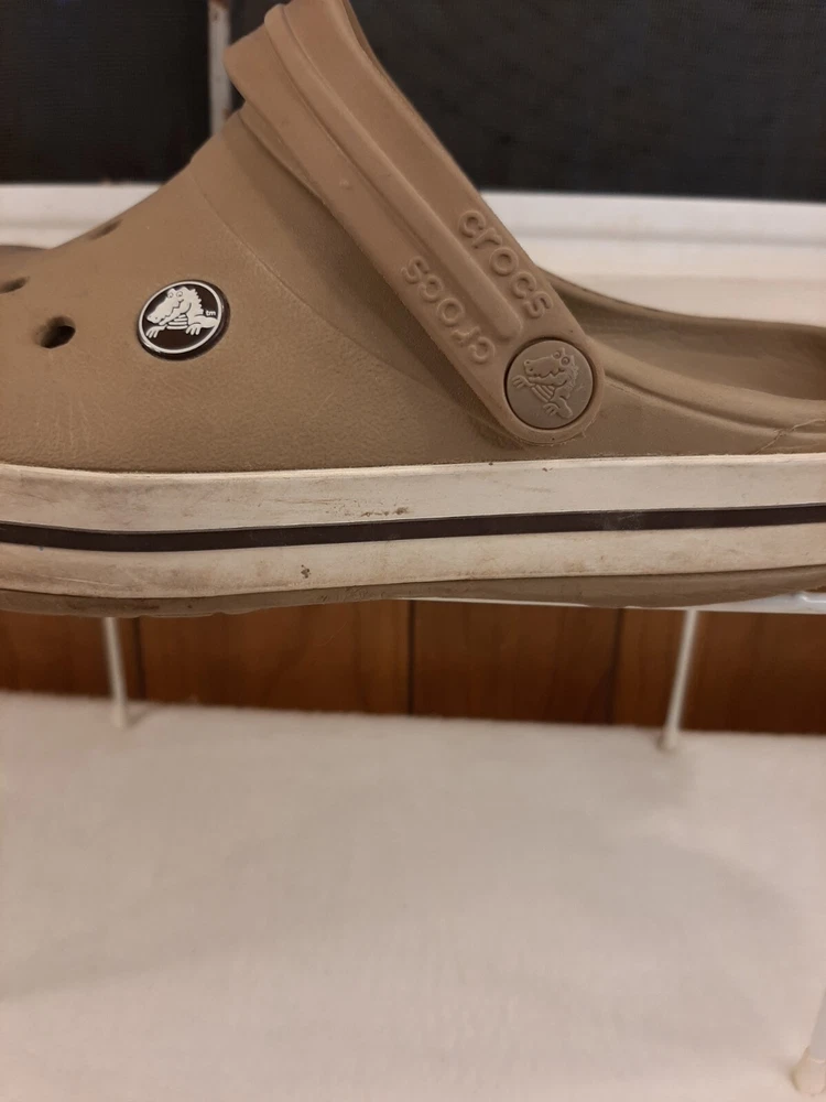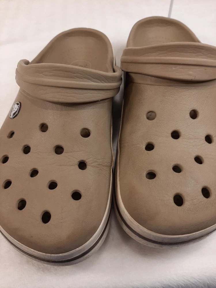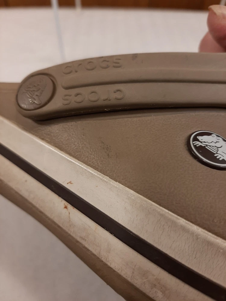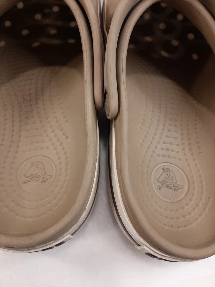 Crocs Classic Clog Tan Brown Size Men’s 6 Women’s 8 Shoes Slip On In good pre-owned condition may show signs of wear from use/handling/storage/display. Please view all pics for condition/details/flaws/issues. SOLD AS IS The white rubber trim has spots/dirt leaving cleaning to buyer. the bottoms have wear/drag on toe areas & heels & there is a small separation along the withe rubber trim please see photo 21 for this, please see all photos for details. There is/maybe marks/spots/dirt/debris please see photos 1-22, there is/maybe paint loss/sticker loss please see photos 1-22, there is lite discoloration please see photos 1-22, there are surface scratches to item please see photos 1-22, please see all photos for condition/issues/details.