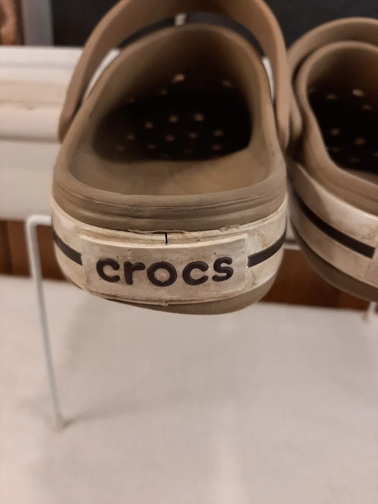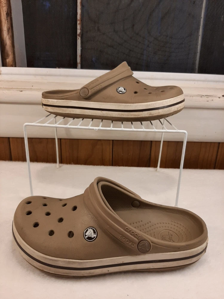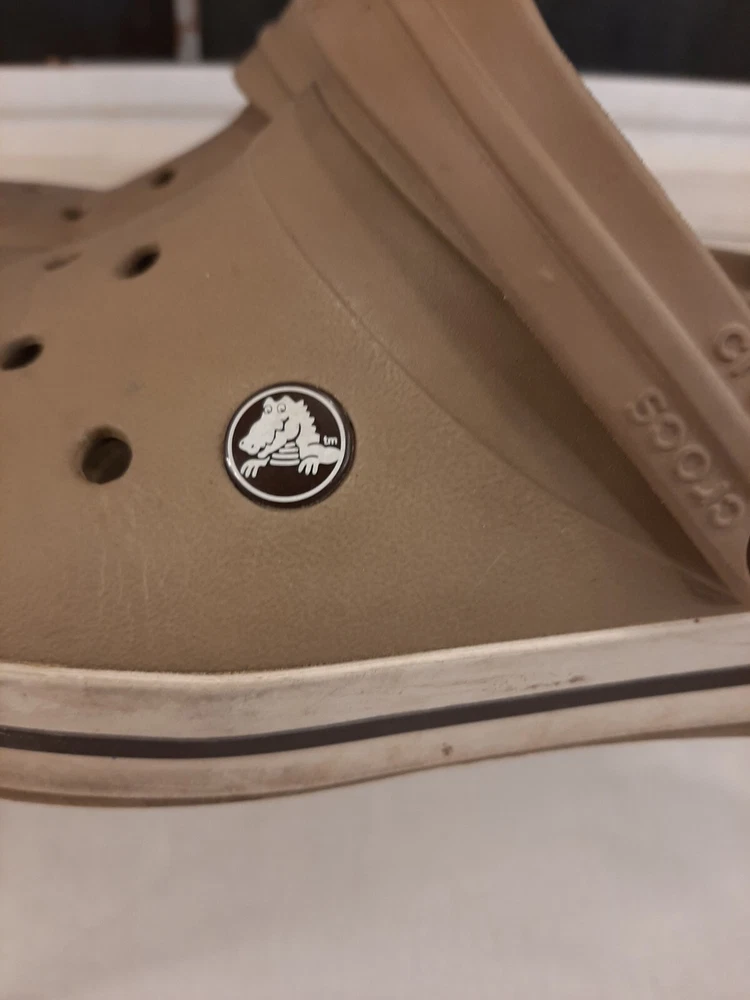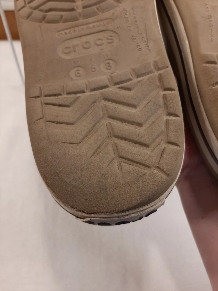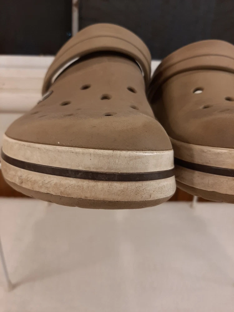 Crocs Classic Clog Tan Brown Size Men’s 6 Women’s 8 Shoes Slip On In good pre-owned condition may show signs of wear from use/handling/storage/display. Please view all pics for condition/details/flaws/issues. SOLD AS IS The white rubber trim has spots/dirt leaving cleaning to buyer. the bottoms have wear/drag on toe areas & heels & there is a small separation along the withe rubber trim please see photo 21 for this, please see all photos for details. There is/maybe marks/spots/dirt/debris please see photos 1-22, there is/maybe paint loss/sticker loss please see photos 1-22, there is lite discoloration please see photos 1-22, there are surface scratches to item please see photos 1-22, please see all photos for condition/issues/details.