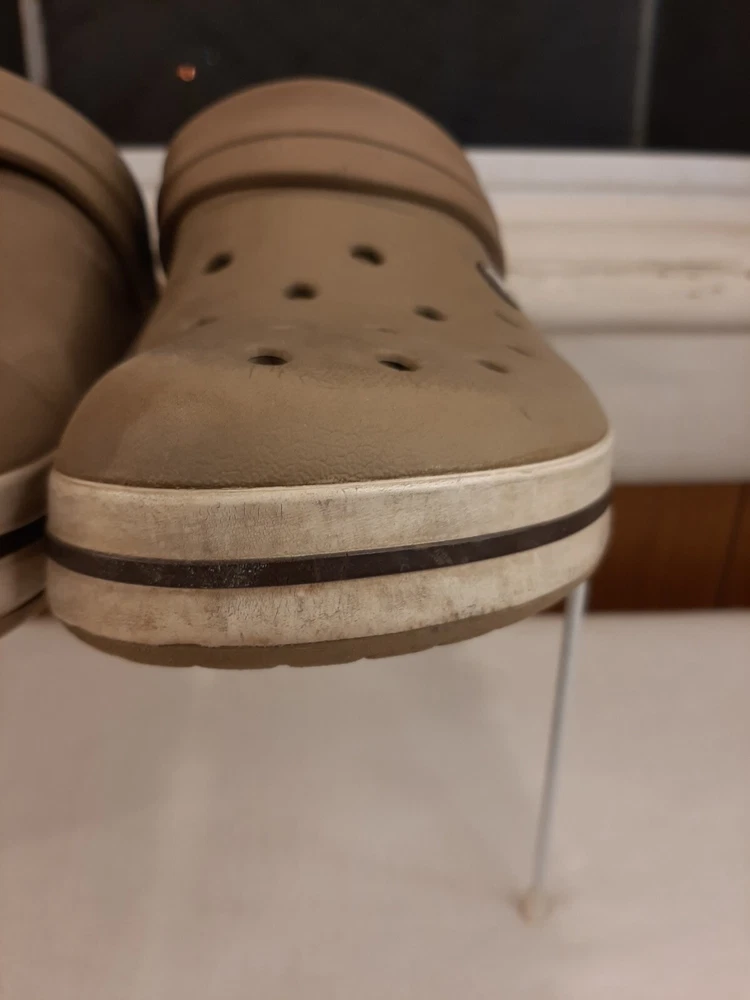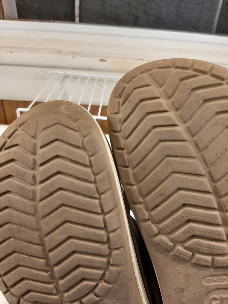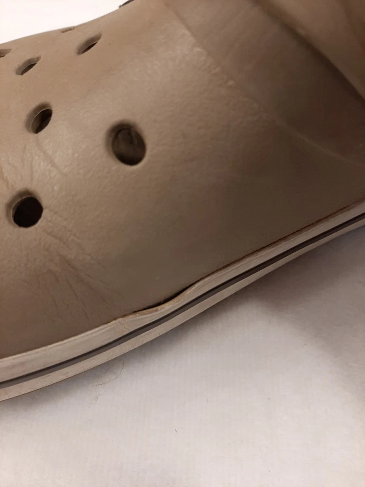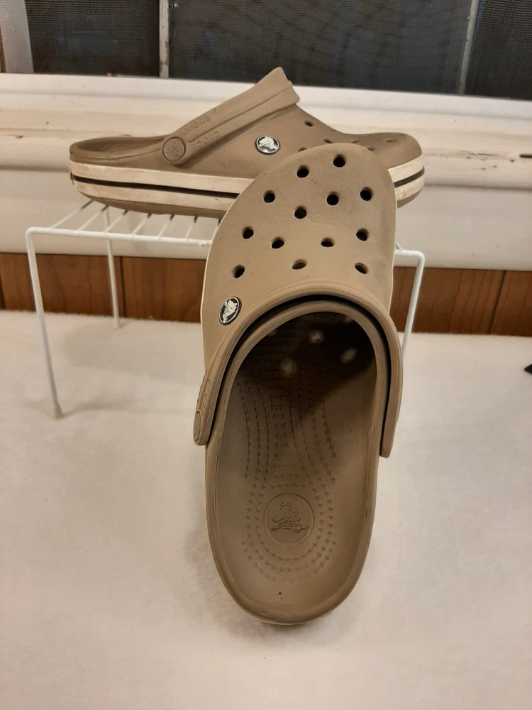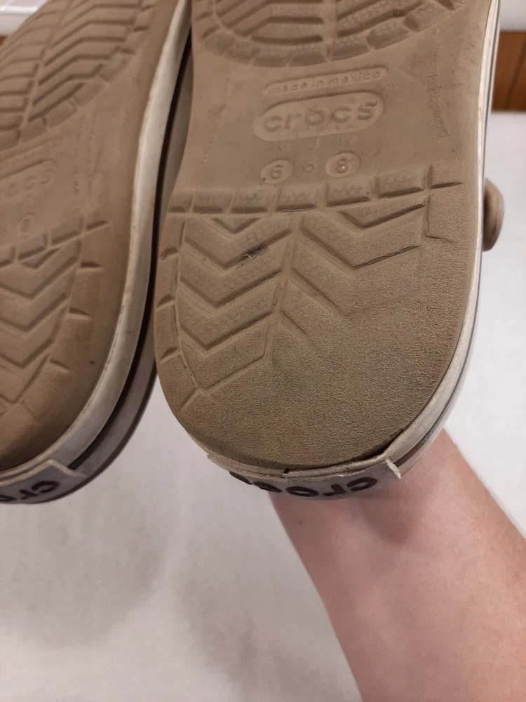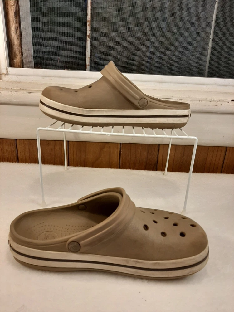 Crocs Classic Clog Tan Brown Size Men’s 6 Women’s 8 Shoes Slip On In good pre-owned condition may show signs of wear from use/handling/storage/display. Please view all pics for condition/details/flaws/issues. SOLD AS IS The white rubber trim has spots/dirt leaving cleaning to buyer. the bottoms have wear/drag on toe areas & heels & there is a small separation along the withe rubber trim please see photo 21 for this, please see all photos for details. There is/maybe marks/spots/dirt/debris please see photos 1-22, there is/maybe paint loss/sticker loss please see photos 1-22, there is lite discoloration please see photos 1-22, there are surface scratches to item please see photos 1-22, please see all photos for condition/issues/details.