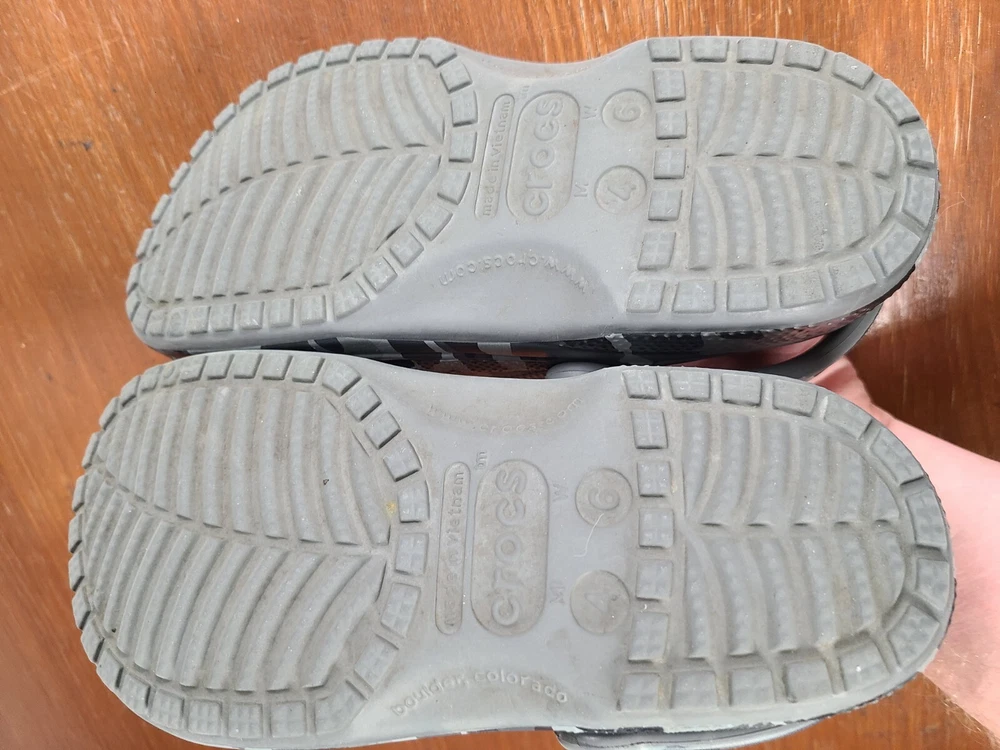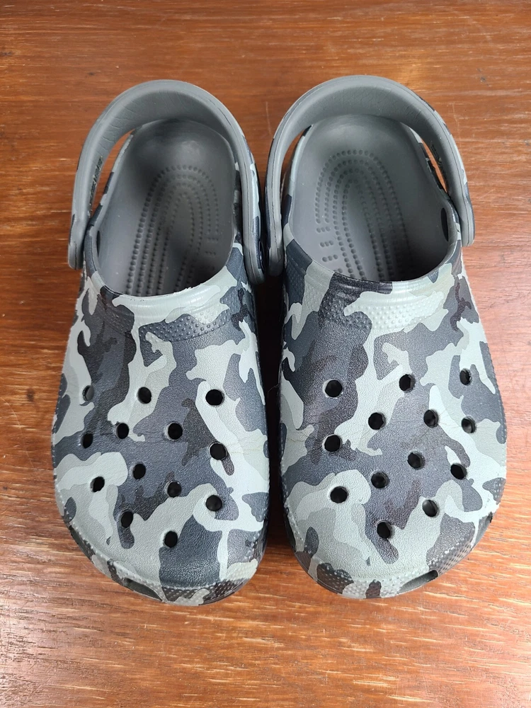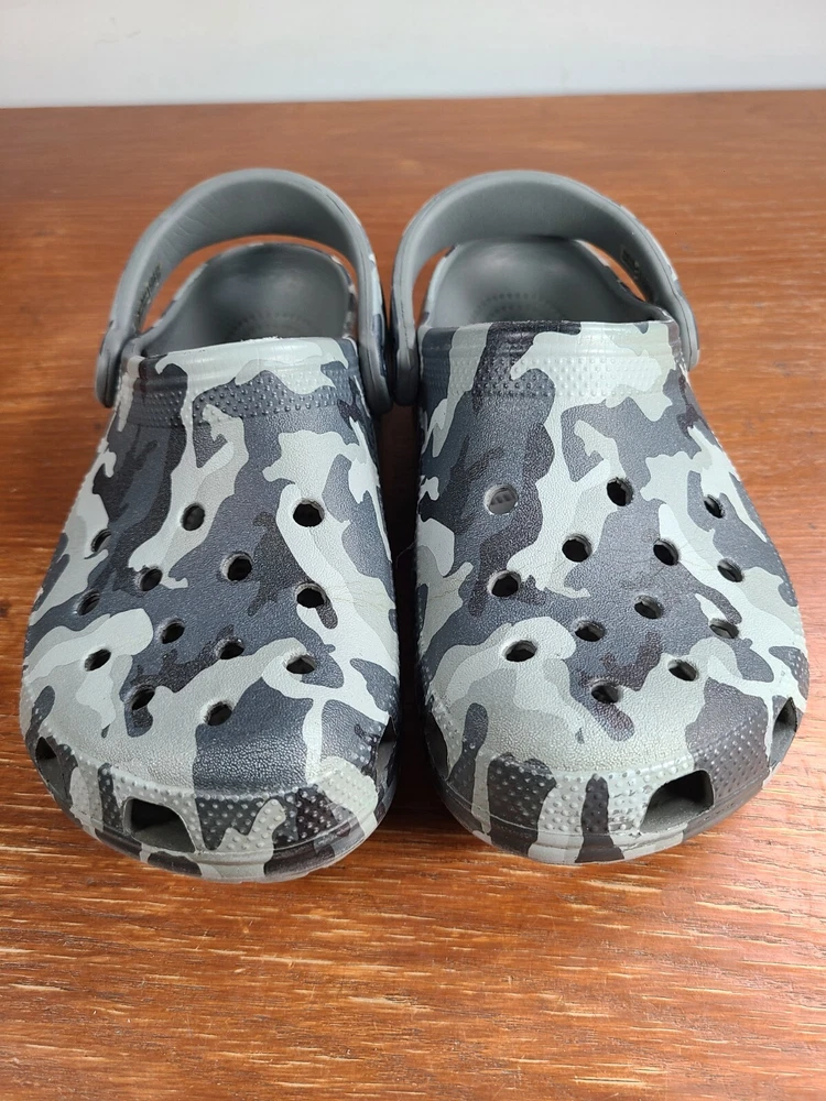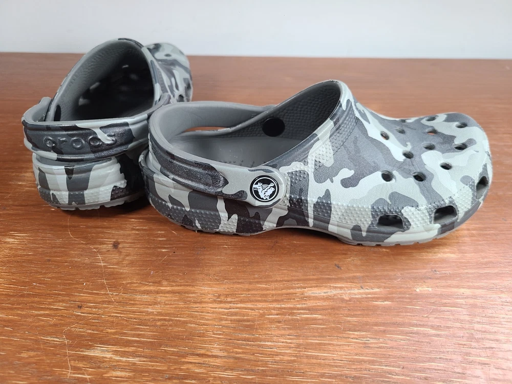 Crocs Classic Printed Camo Clogs Grey Camo 206454 Mens Size 4 Womens Size 6. Crocs are in preowned condition. See pictures for details. Please ask any questions before purchase. If there is any issue, please contact us first before leaving feedback. Thank you.