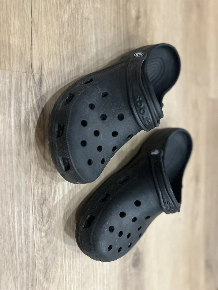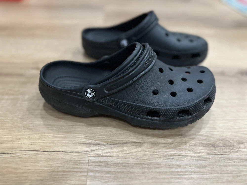 Get your hands on the Crocs Classic Unisex Classic Clogs in black, size M10W12. These clogs are perfect for travel, activewear, casual wear, and workwear. The slip-on style and round toe shape make them easy to wear and comfortable. The rubber upper material, lining material, and outsole material ensure durability and support. The clogs feature a cushioned, breathable, and comfortable design with a flat heel style and low top shoe shaft style. The strap and logo accents add a touch of style to these classic clogs. They are perfect for walking, beach activities, and driving. The Crocs Classic Unisex Classic Clogs are a must-have for anyone looking for comfort and style.