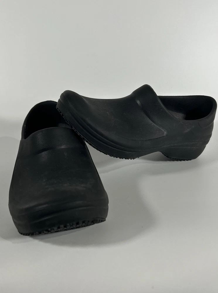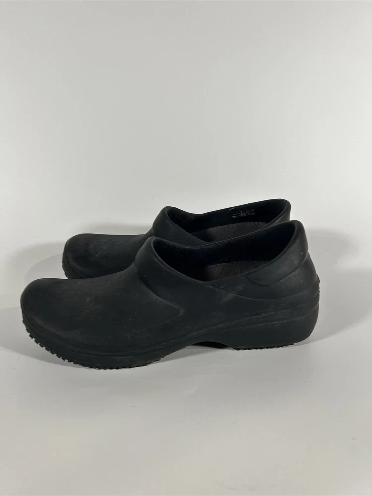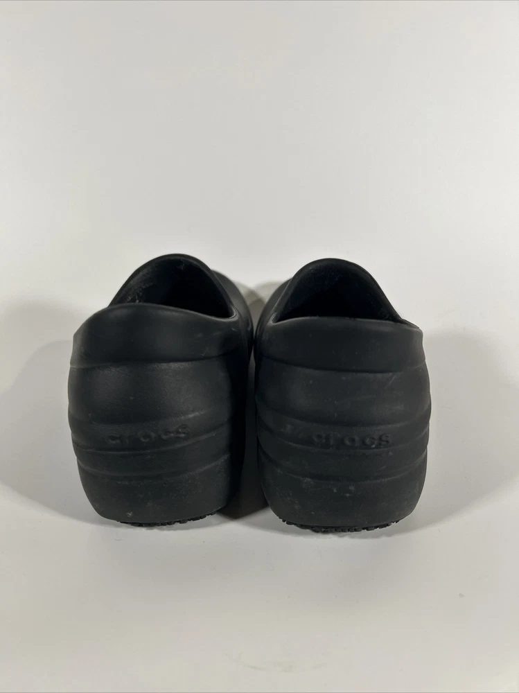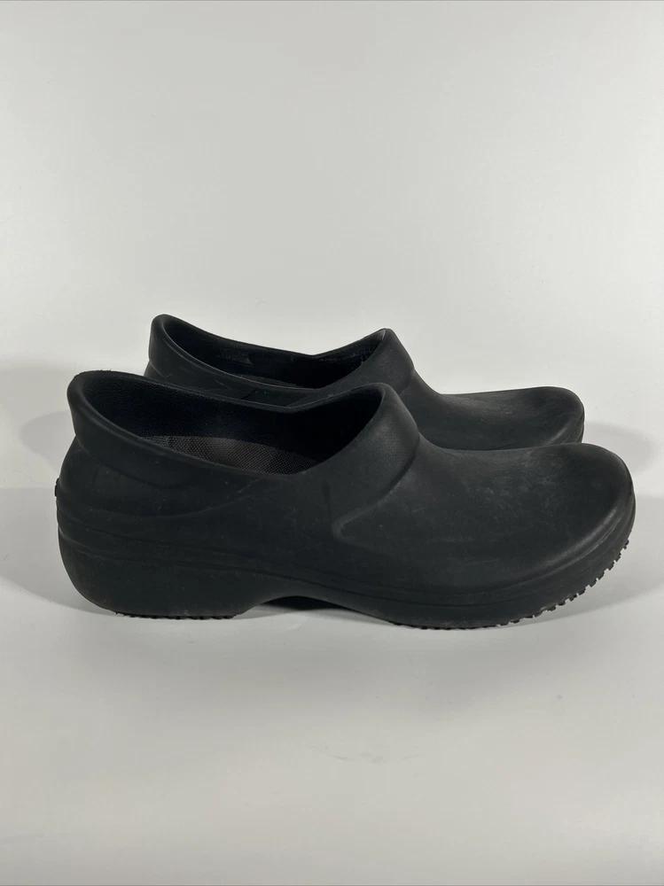Elevate your style with these black Crocs clogs. These slip-on shoes have a closed toe with a low-top shoe shaft style, making them a perfect fit for casual occasions. The shoes have a flat heel style with a slip-resistant rubber outsole, making them ideal for walking during summer, fall, and spring. The shoes are a size 8 in the US and 6.5 in AU, with a standard shoe width and a synthetic lining material. The shoes feature the classic Crocs logo with a solid pattern. They are from the Crocs Neria Pro II model, which provides maximum comfort and slip resistance. The shoes are handmade with rubber as the upper and fabric as the insole material. These shoes are perfect for women who love clogs and want a comfortable pair that can be worn on any occasion. SKU8
