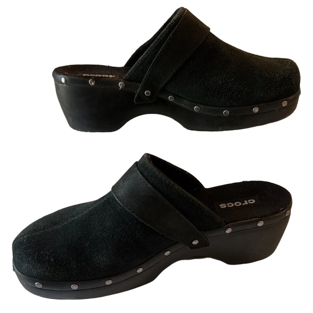Crocs clogs black suede leather with silver rivets slip-on design shearline lined mid-height heel clogs standard shoe width ** all items stored in a smoke-free & pet free home