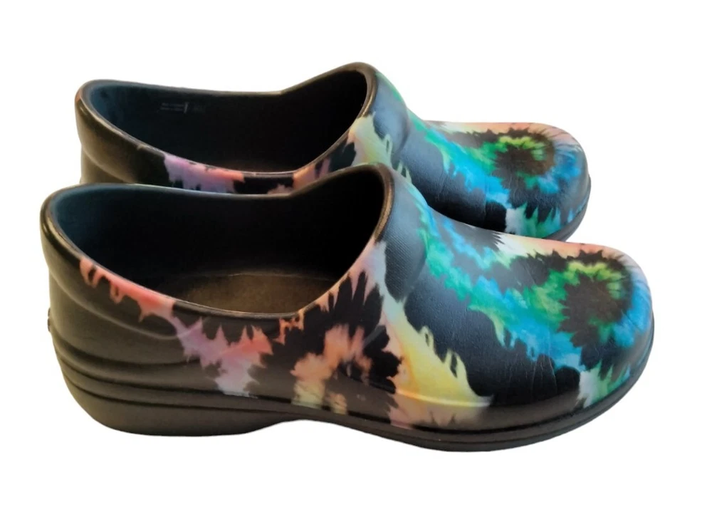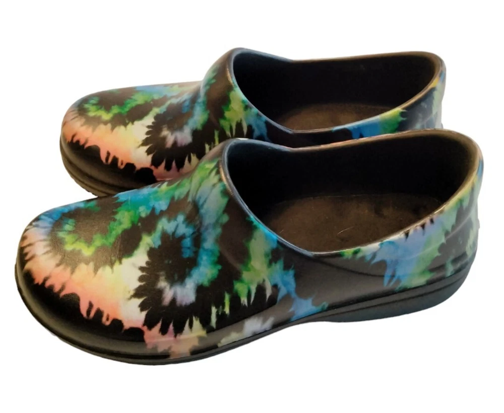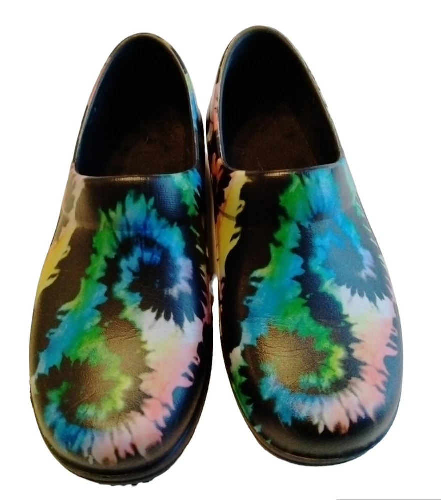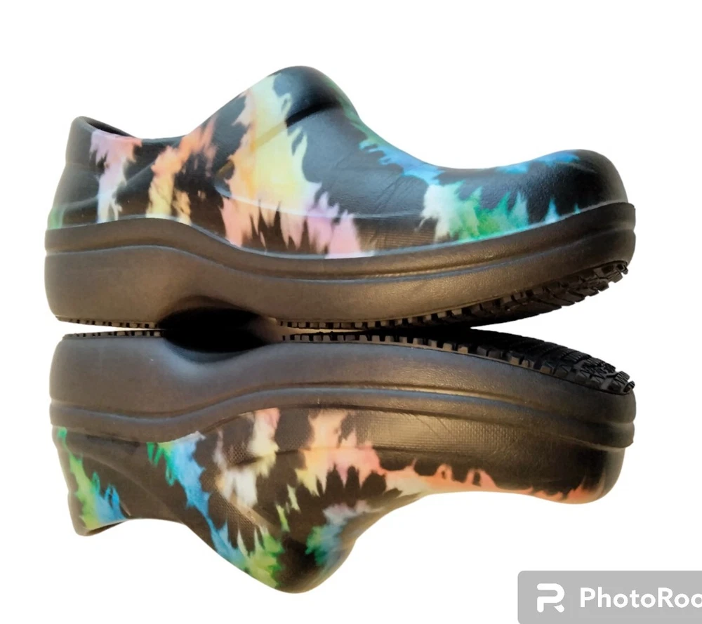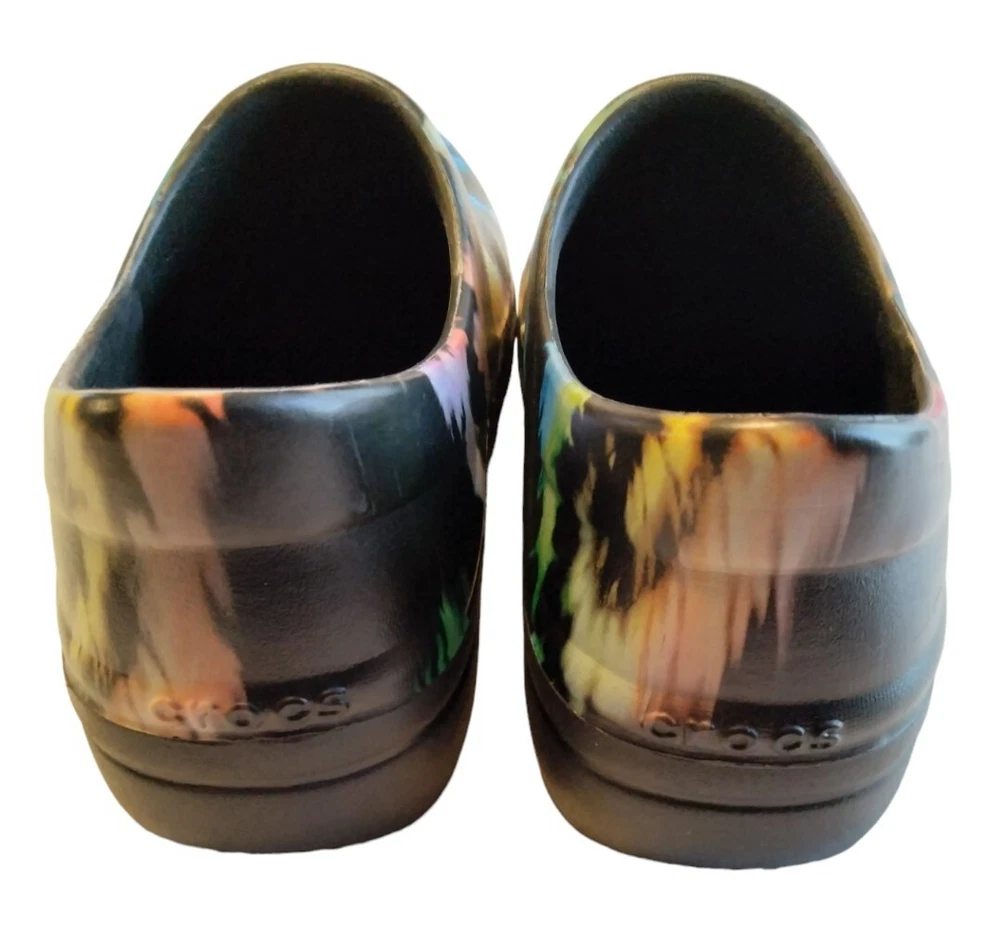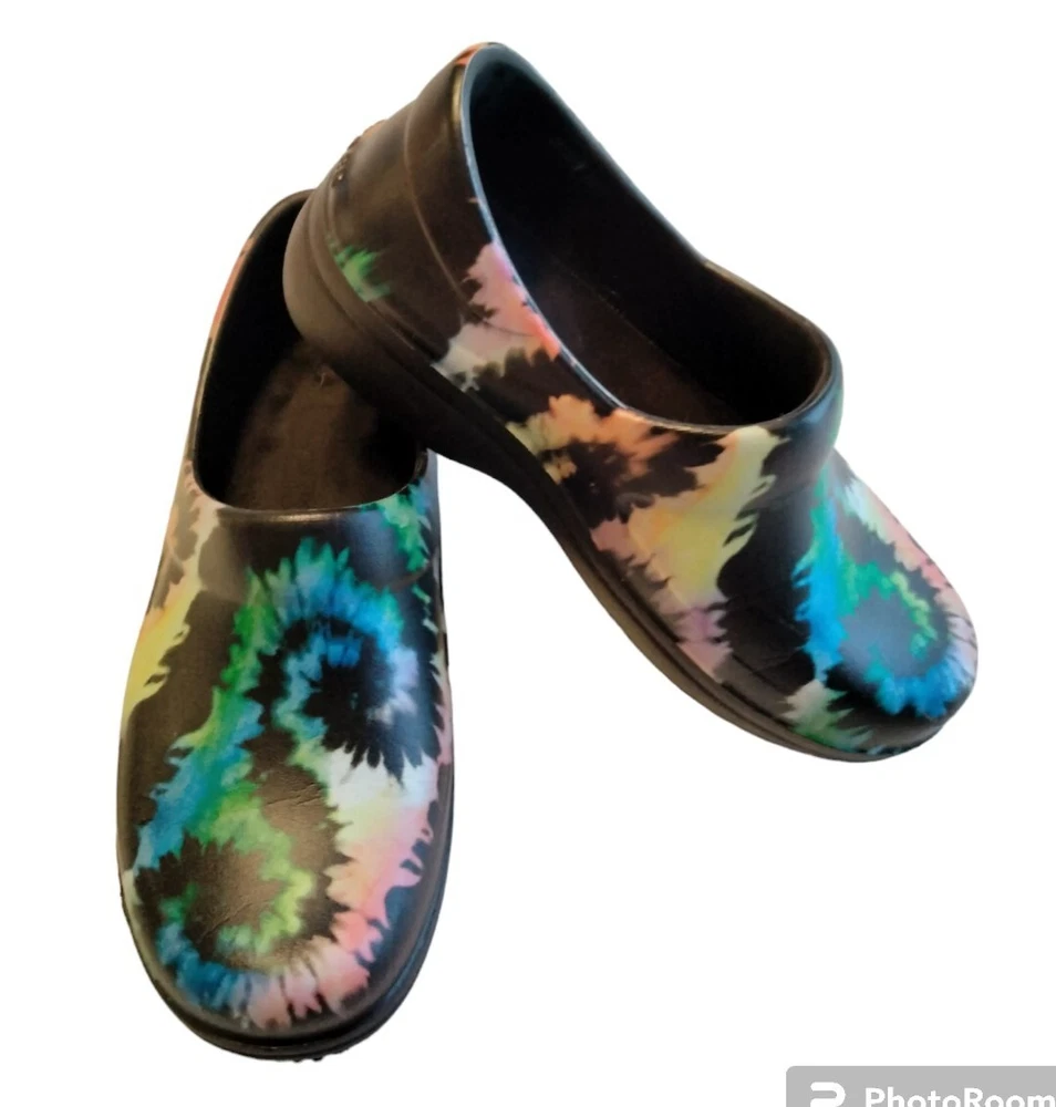 Elevate your style with these comfortable and slip-resistant Crocs clog shoes in a trendy tie-dye mandala paisley design. Perfect for walking, traveling, and workwear, these shoes feature a low wedge heel, round toe shape, and a slip-on closure that make them a versatile addition to your wardrobe. The rubber outsole provides excellent grip, while the foam insole offers great comfort. These Crocs clog shoes come in a standard shoe width and are made with synthetic upper material and croslite lining material. The shoes are perfect for women who wear US shoe size 8 and UK shoe size 9. Preowned and in good condition. The soles look new.