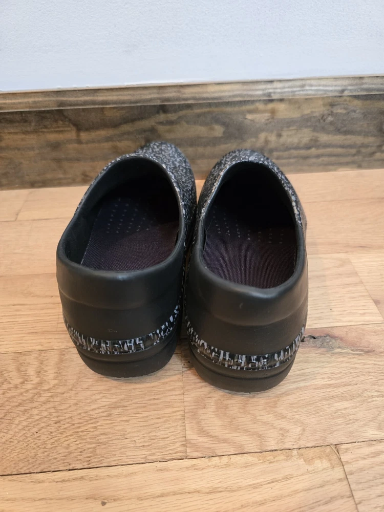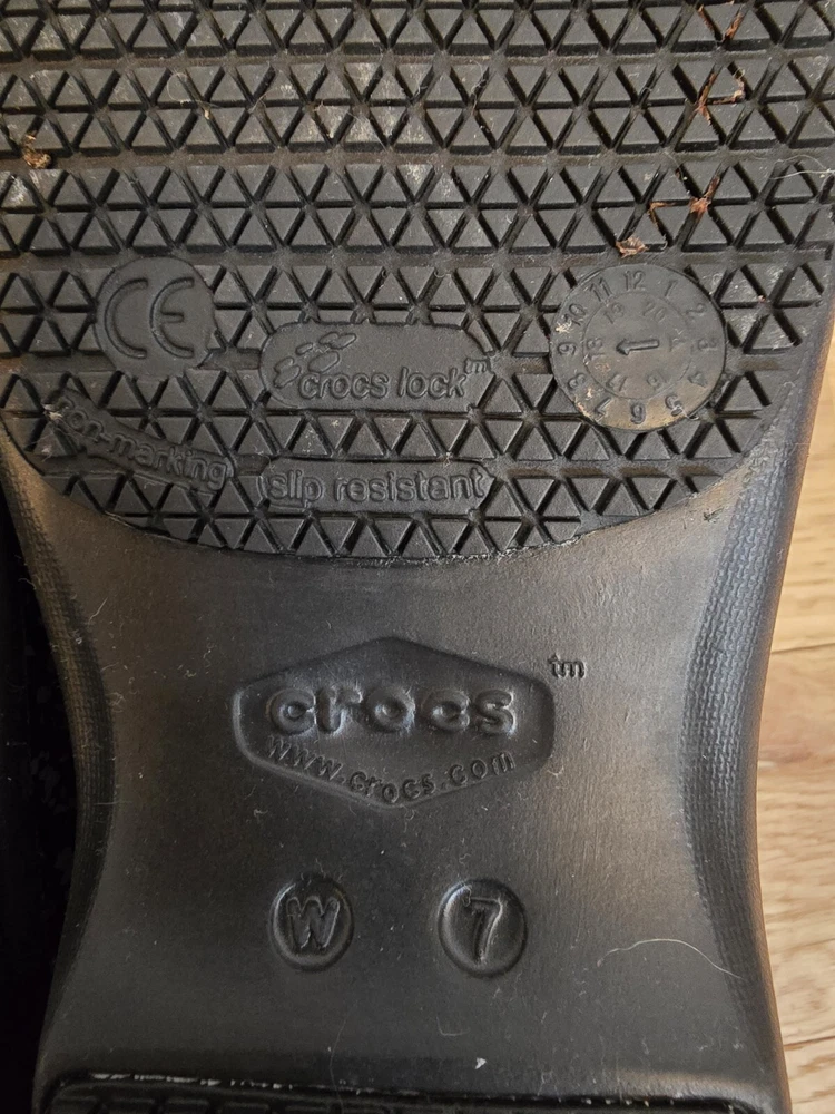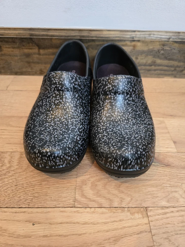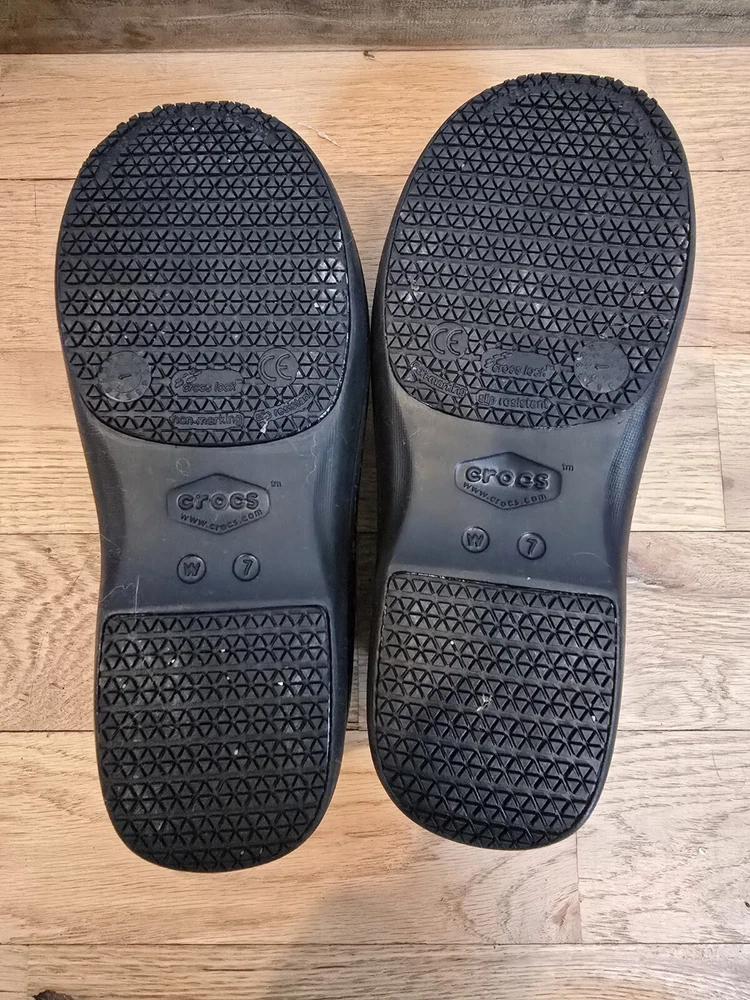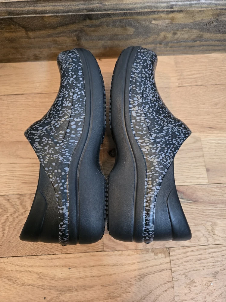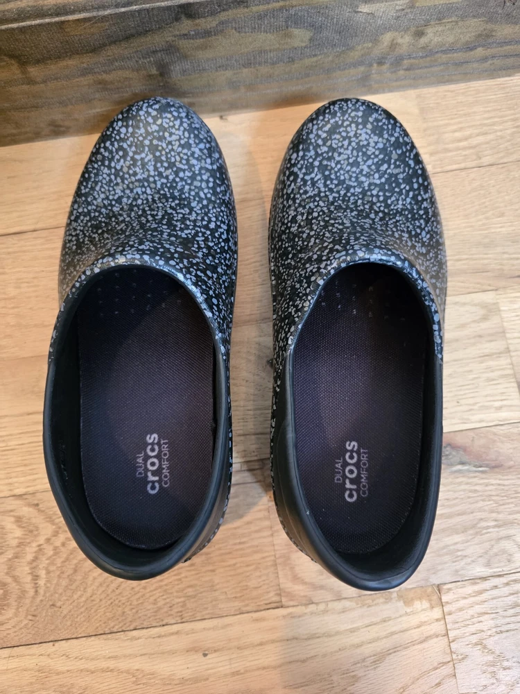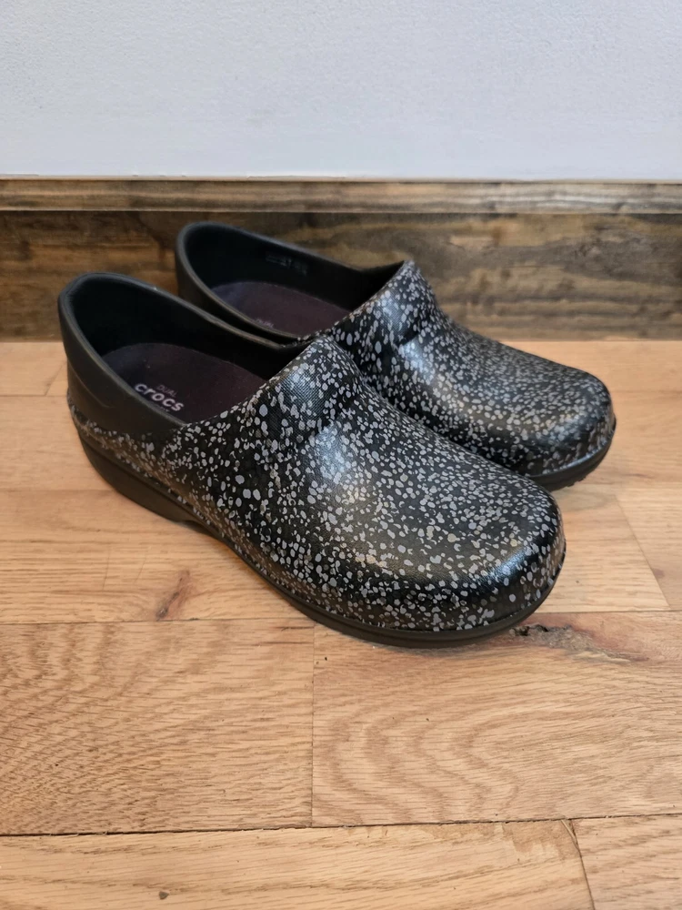The Crocs Neria Pro II Clog Shoes are designed for women in size 7 with a round toe shape and slip-on closure. These black shoes feature a speckled gray pattern and are accented with the Crocs logo. They have a low 1.5" heel height and are suitable for various occasions such as travel, activewear, casual outings, and workwear. With features like arch support, slip resistance, and dual comfort, these Crocs provide a comfortable and water-friendly option for professionals like nurses, hairdressers, bartenders, and waitresses.
