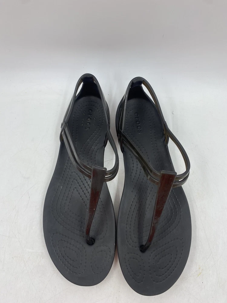 This is a pair of black Crocs Isabella t strap sandals. They are a women's size 6 and are in good overall condition with normal signs of wear. They could have light scuffs or sole wear. You get the actual items pictured so please look at all photos and ask any questions before purchase.