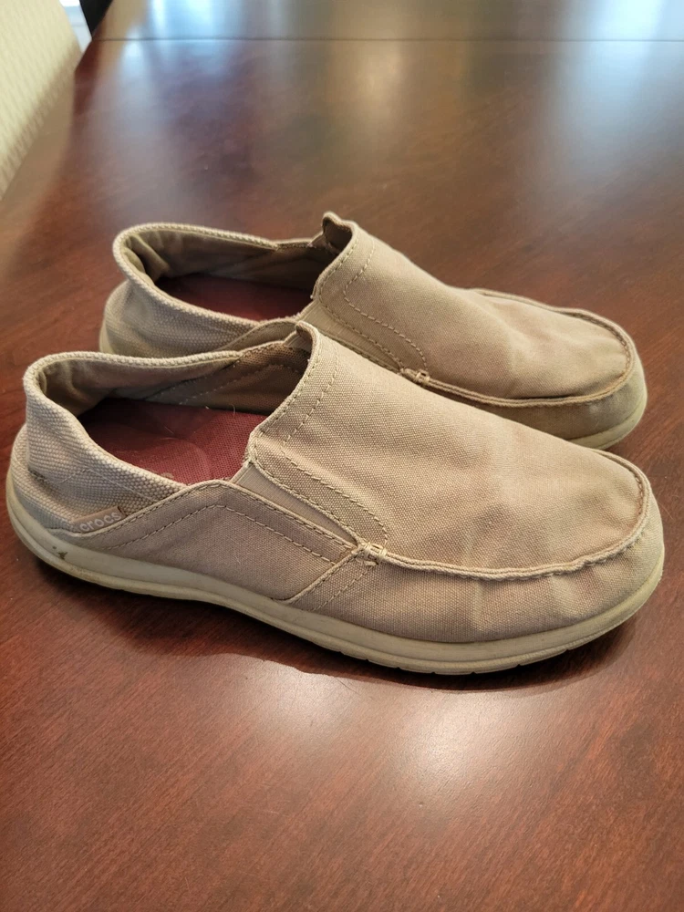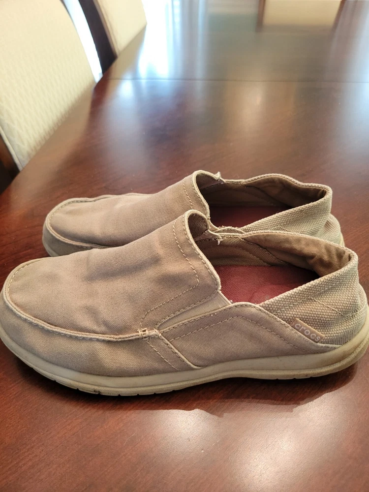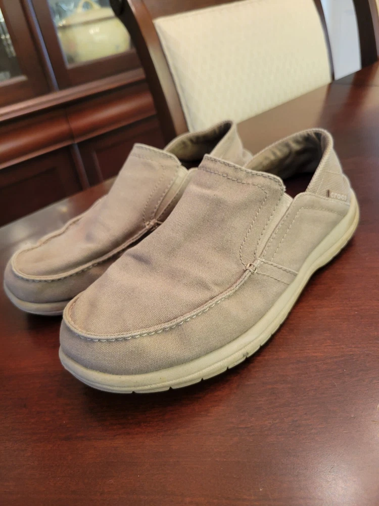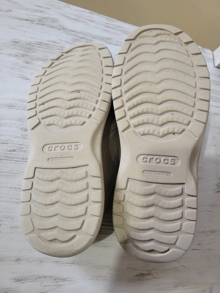These khaki Crocs are a great addition to any man's wardrobe.They look a little more green than they do in the picture. The Crocs website lists this color as "khaki." They are a size 9. Very comfortable. Still have lots of life left in them!