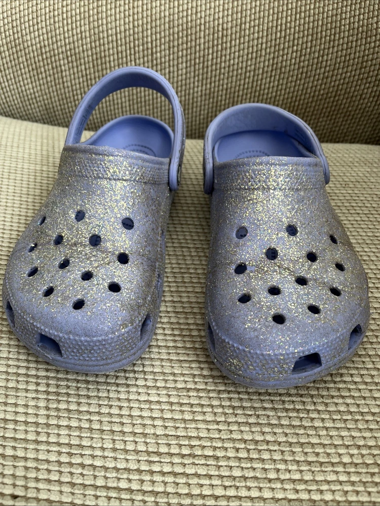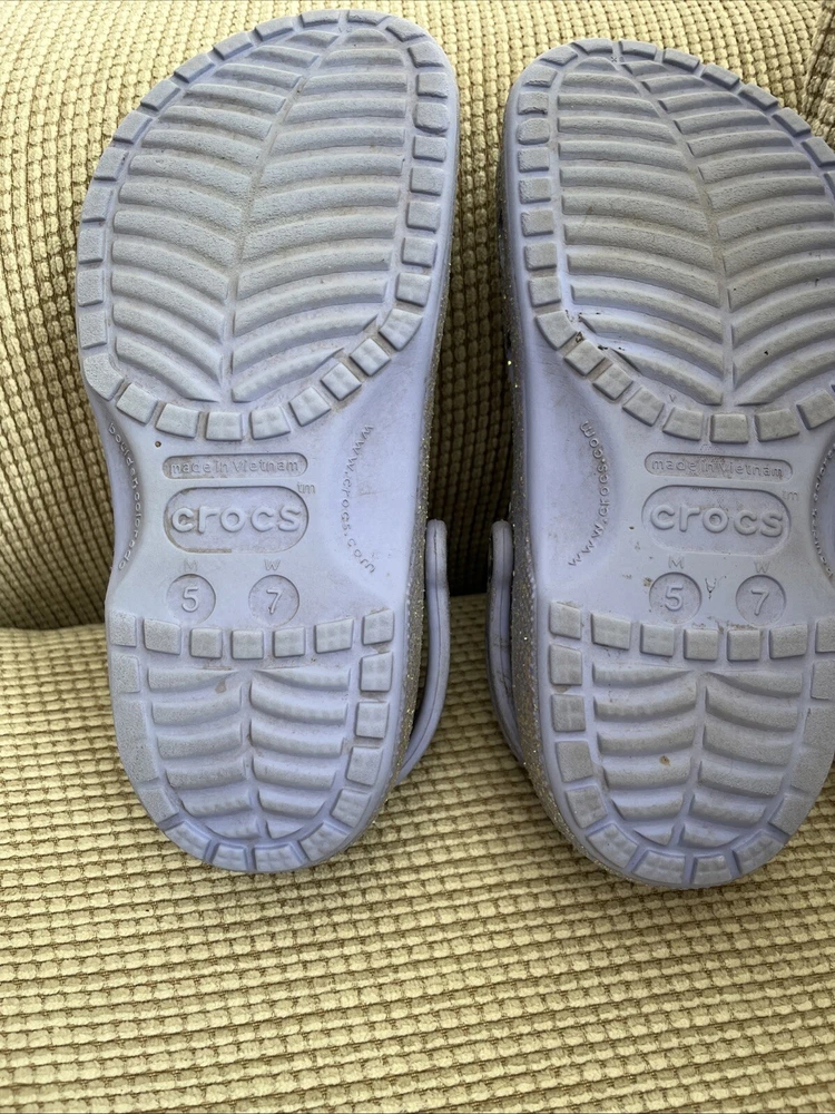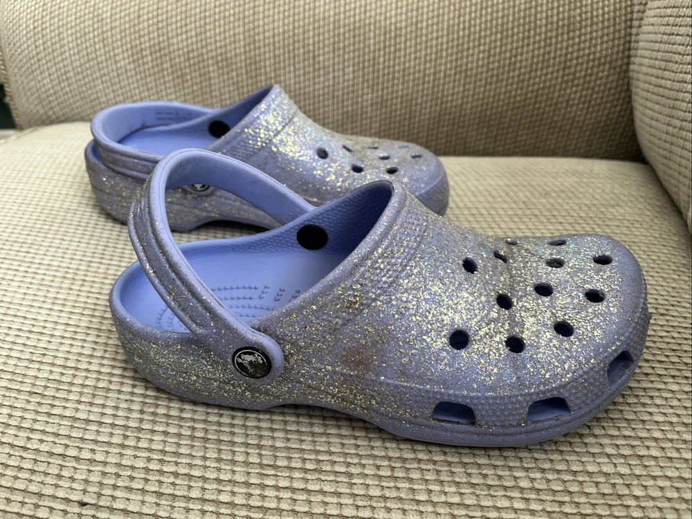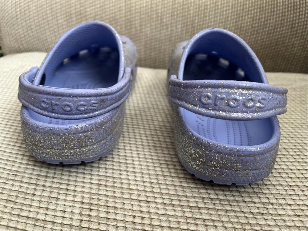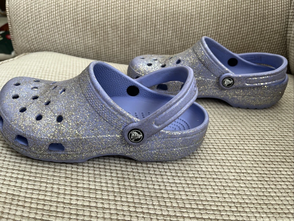 These Crocs women’s Size 7, Men’s 5 Purple Glitter Classic Clog Sandals are slip-on clog sandals featuring a glittery purple design, perfect for casual or travel wear. The flat heel and straps provide comfort and support for activities like walking or school. Made with Croslite material, these sandals offer a blend of comfort and style, making them a classic choice for the summer, fall, or spring seasons. Perfect for those looking for a fun and easy-to-wear shoe option.