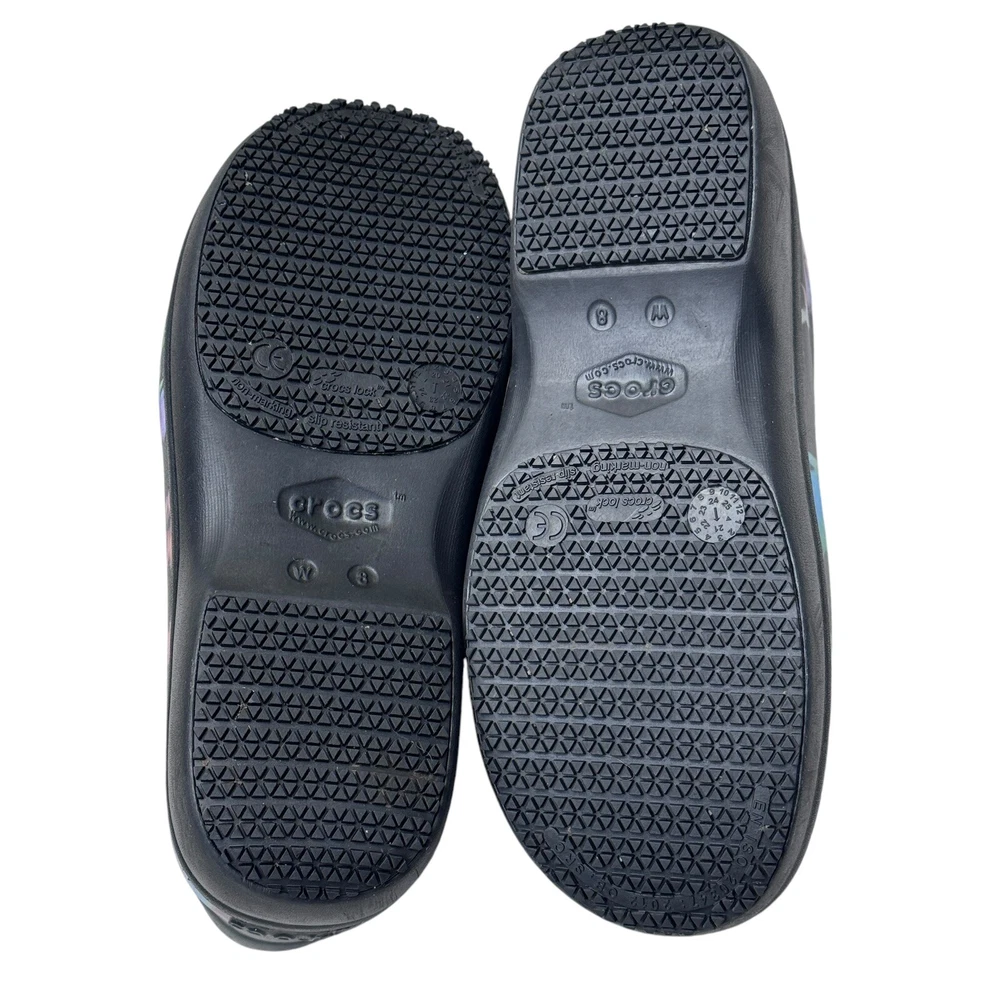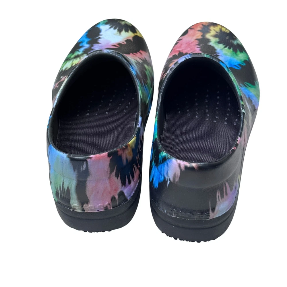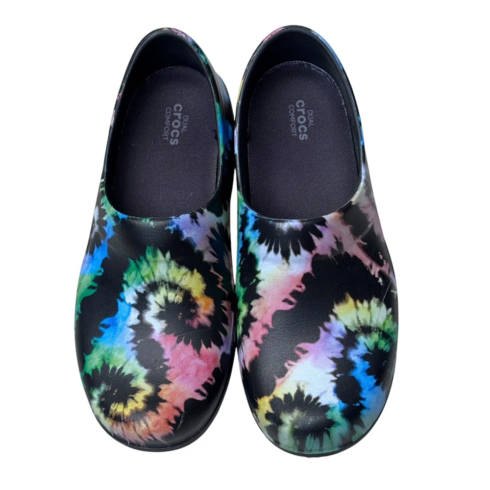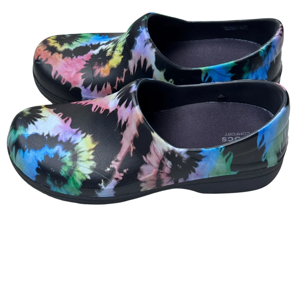 The Crocs Neria Pro II Tie Dye Nurse Clogs in size 8 are comfortable slip-on shoes designed for women. Featuring a colorful tie-dye pattern, these round toe clogs have a low heel height and are suitable for travel, casual outings, or workwear. The dual comfort design provides cushioning and support, making them ideal for activities like nursing. With a non-marking and non-slip sole, these rubber shoes offer a secure and comfortable fit for all-day wear.