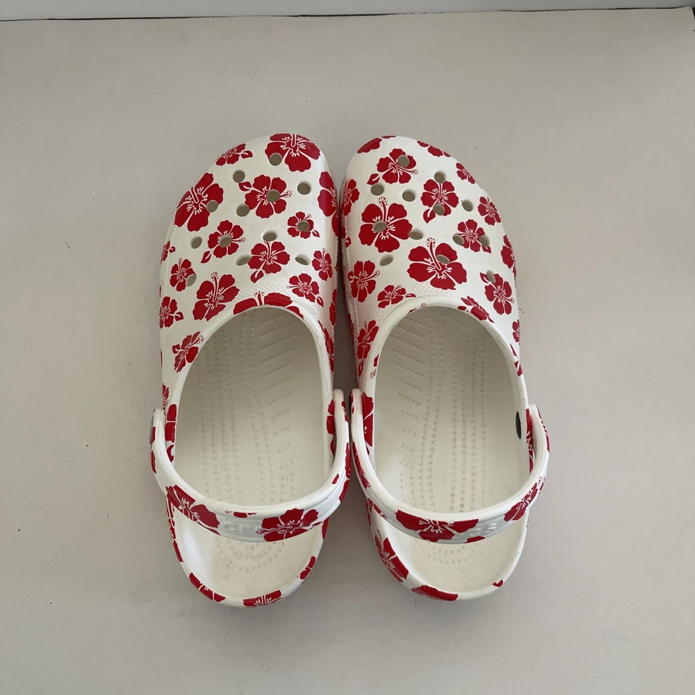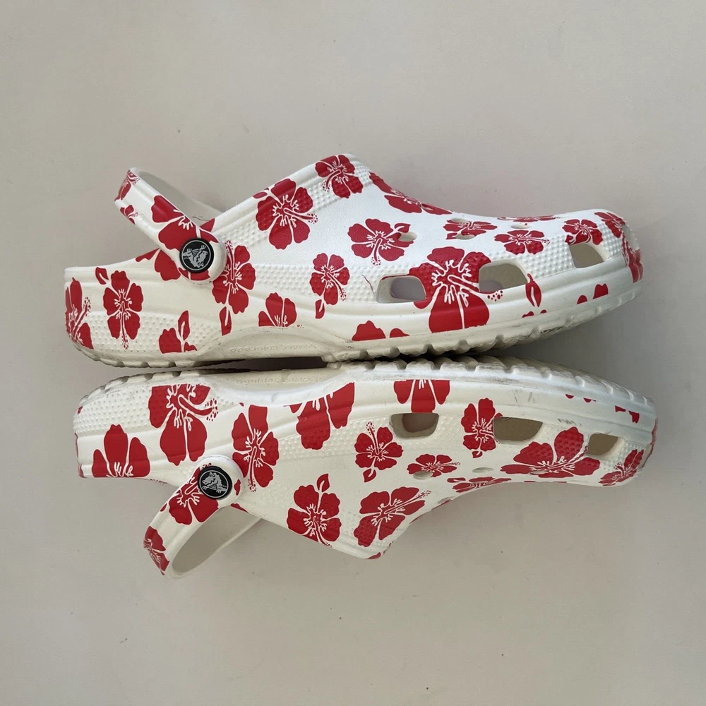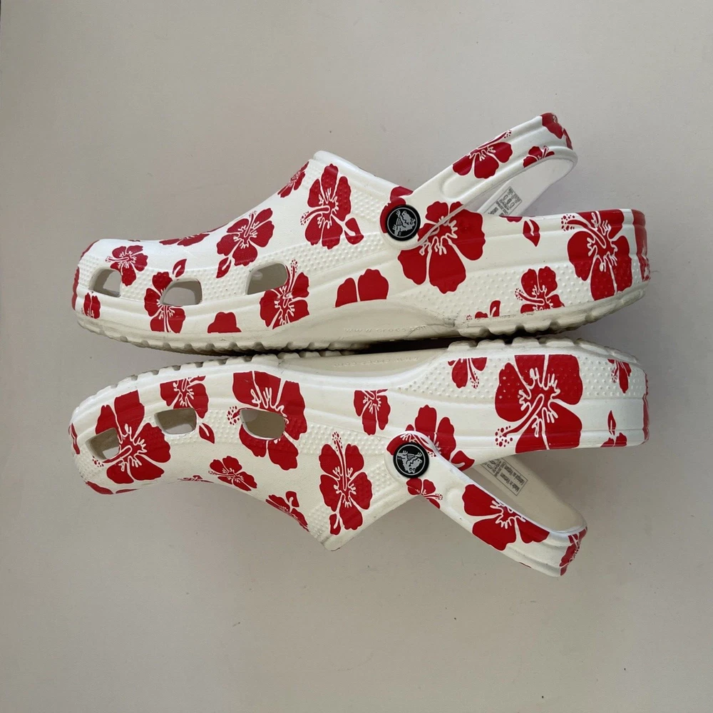 Crocs Resort White with Red Hawaii Floral Hibiscus all over Print Clogs size Men 10 / Women 12