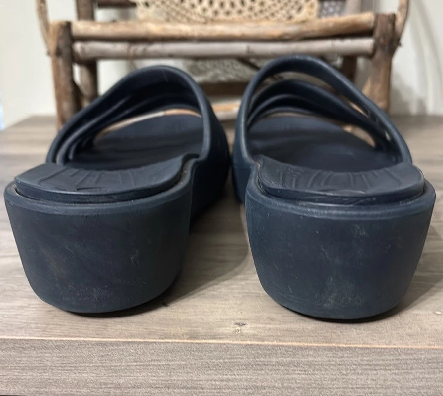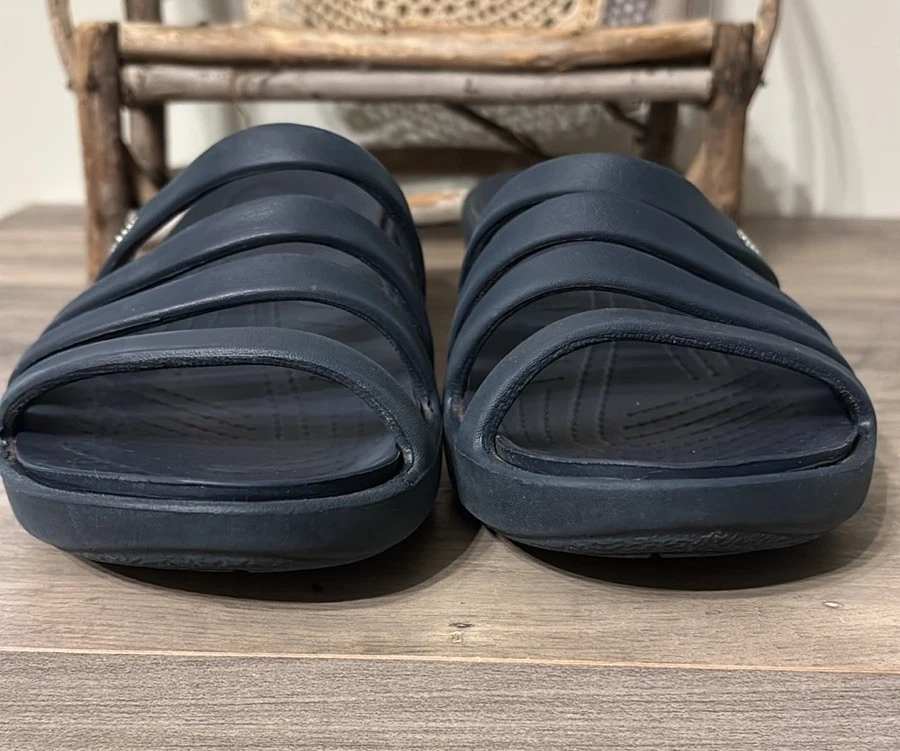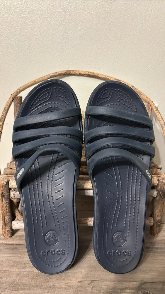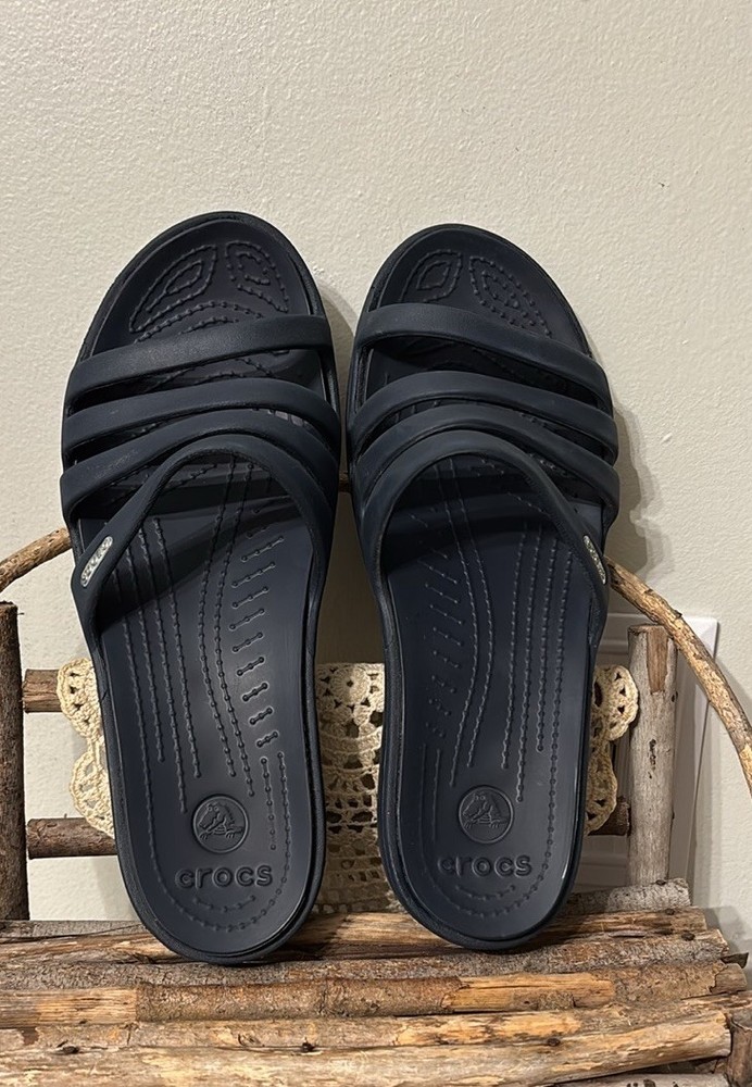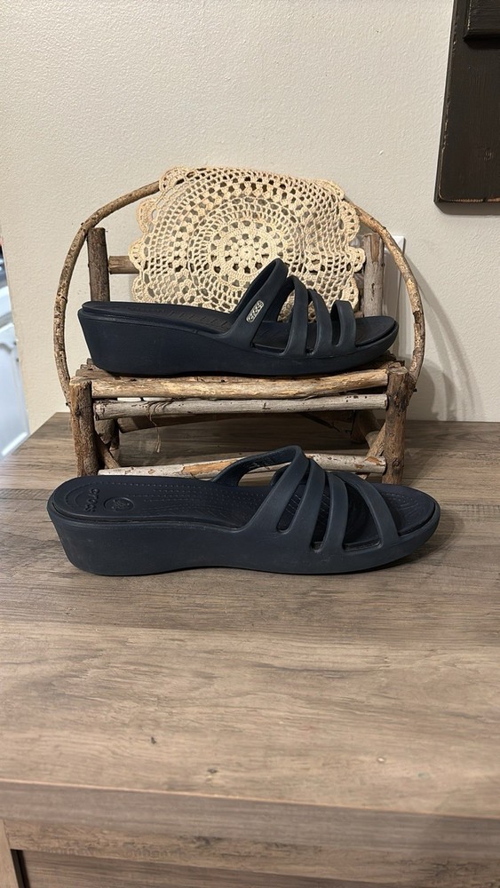Crocs Rhonda Sandals Women's 8W NAVY Comfort Strappy Wedge Slip On Slide Beach. Condition is Pre-owned. Shipped with USPS Ground Advantage.
