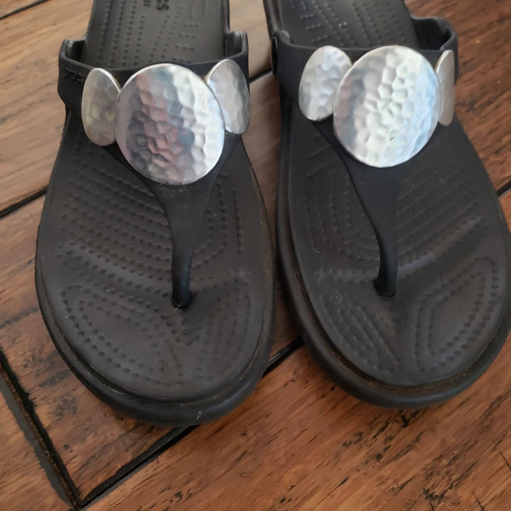 Item: CROCS Sanrah Condition is: Good PRe-Owned Size: 6 Color: Black with "Silver" Medallions Fabric: Synthetic Features: Slip-On, Lightweight Flaws: Limited Wear Closure: Slip-On Care: Wipe Clean Please see all photos for details. Colors may not appear quite the same in photos due to lighting. I try to give the most accurate description possible. I typically ship within 24 hours on Business Days, but much sooner, when possible. B: 14