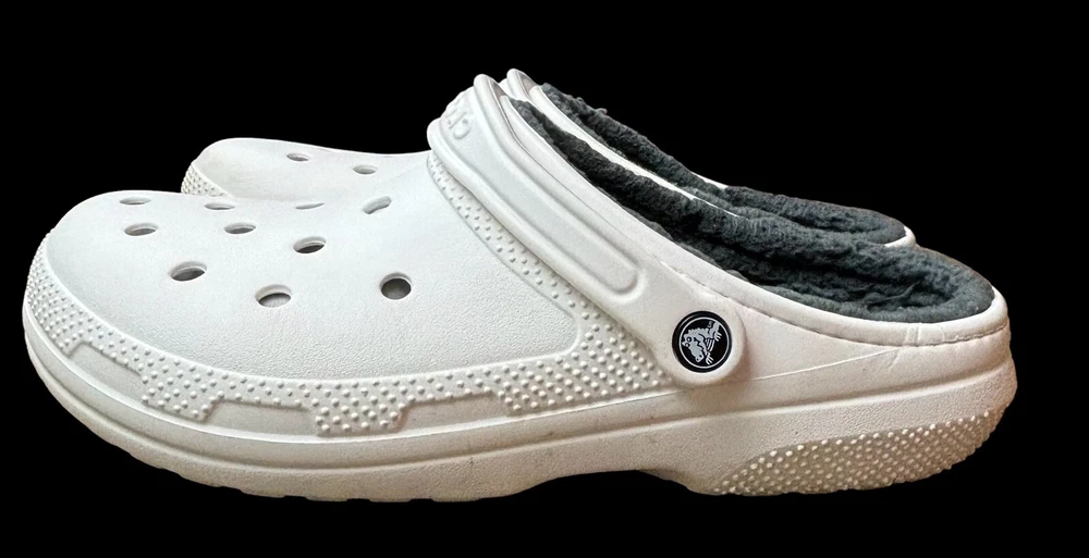 Step into cozy comfort with these Crocs Classic Lined Clogs. Perfect for casual occasions, these slip-on clogs feature a round toe shape and flat heel style. The white rubber upper material is accented with faux fur trim and a solid pattern, giving them a classic theme. The outsole material is made of durable rubber, making them perfect for walking in any season. The clogs are lined with soft fur for added comfort and warmth during winter, fall, and spring seasons. These Crocs are not handmade but feature the Crocs brand and are of type casual. They have standard shoe width. Mens 10 Women’s 12