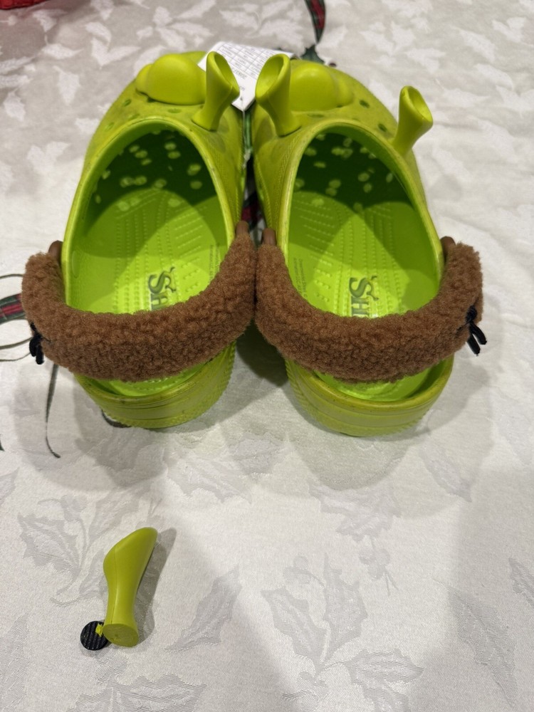 Crocs Shrek Classic Clog in green, featuring a Shrek character theme from the Dreamworks movie. This slip-on clog is designed for men in size 9 and women in size 11. Made with synthetic upper material, it is a casual shoe with a unique and playful design inspired by the popular animated film. One of the antennas is broken as shown in the pictures, it could easily be fixed with a bit of super glue. Please only order if you are okay with that. Message me with any questions