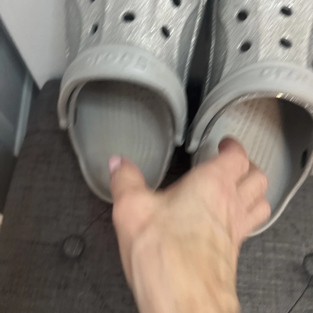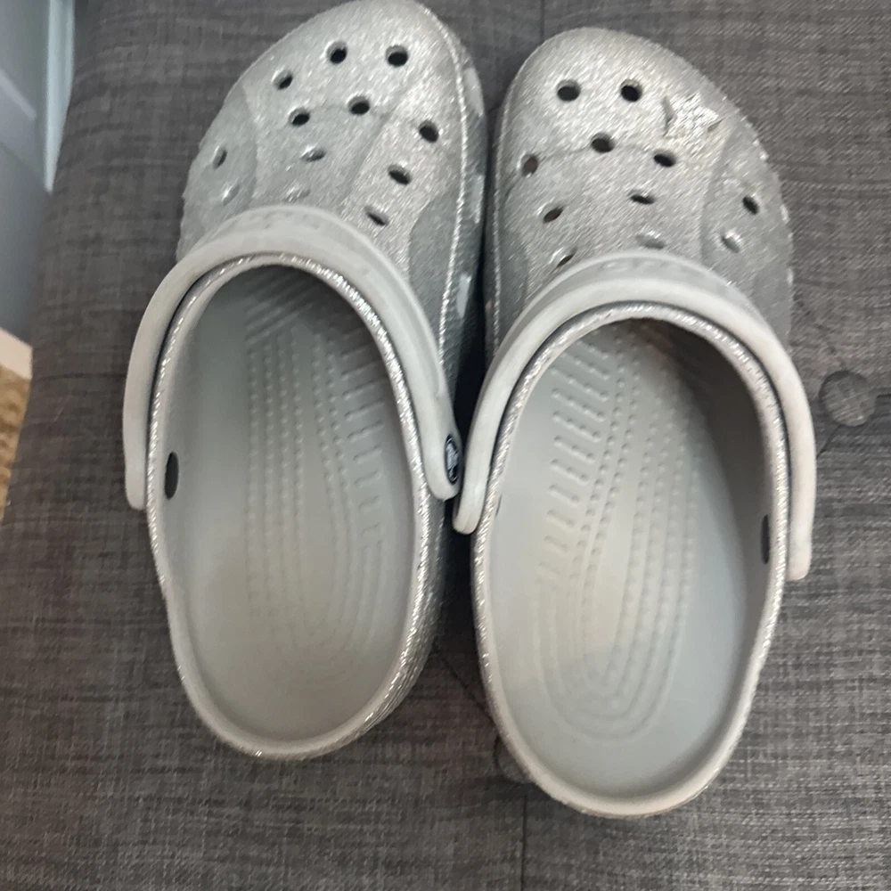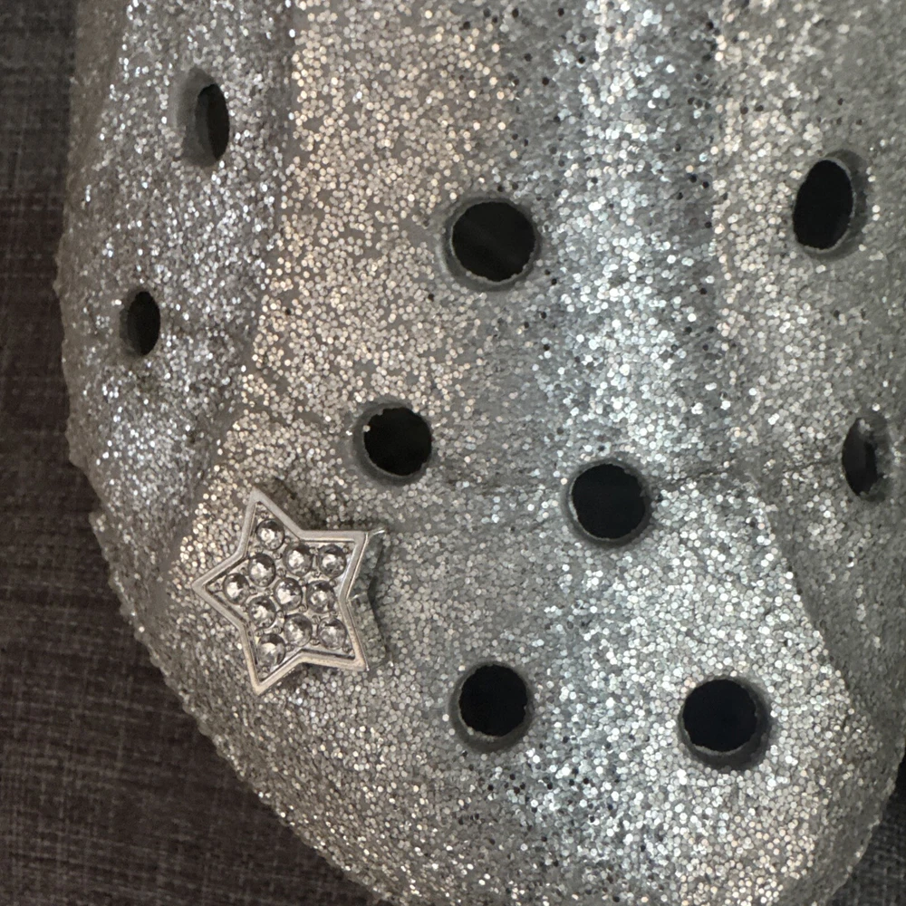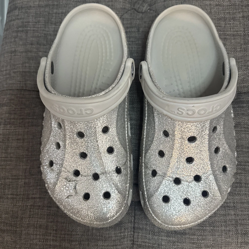 Crocs Silver Glitter Clog Shoes are unisex, featuring a round toe, slip-on closure, low heel, and ankle strap. The silver color with a classic design and colorful accents make them suitable for travel, activewear, casual, and workwear occasions. These lightweight clogs provide cushioned comfort, arch support, and breathability, ideal for walking, school, beach, skateboarding, and fishing activities in any season.