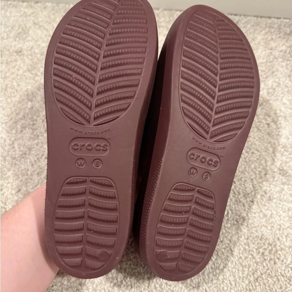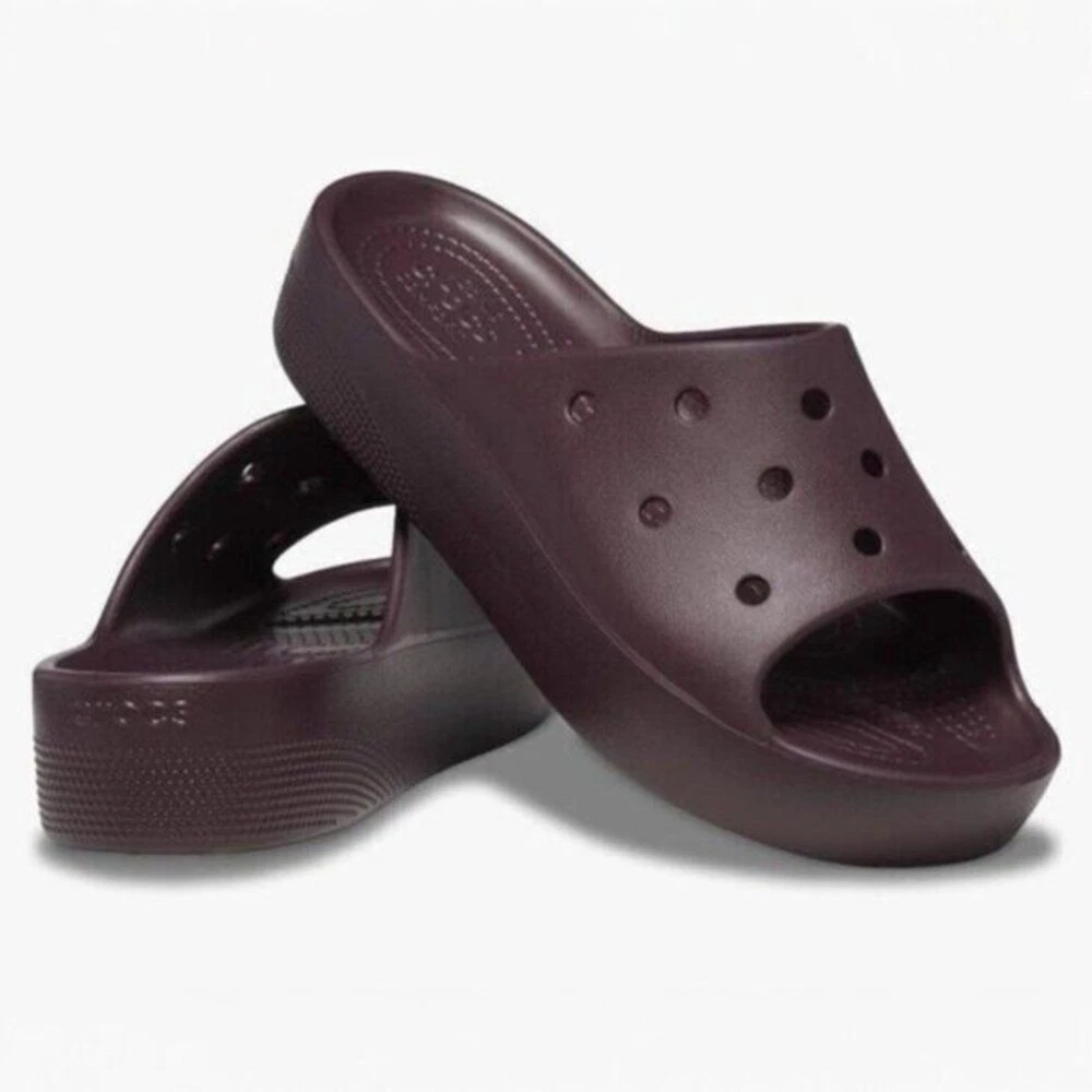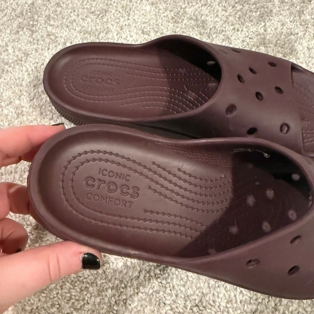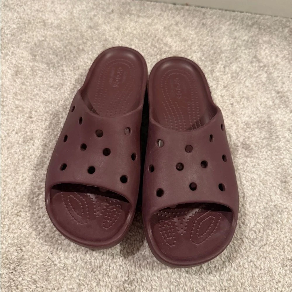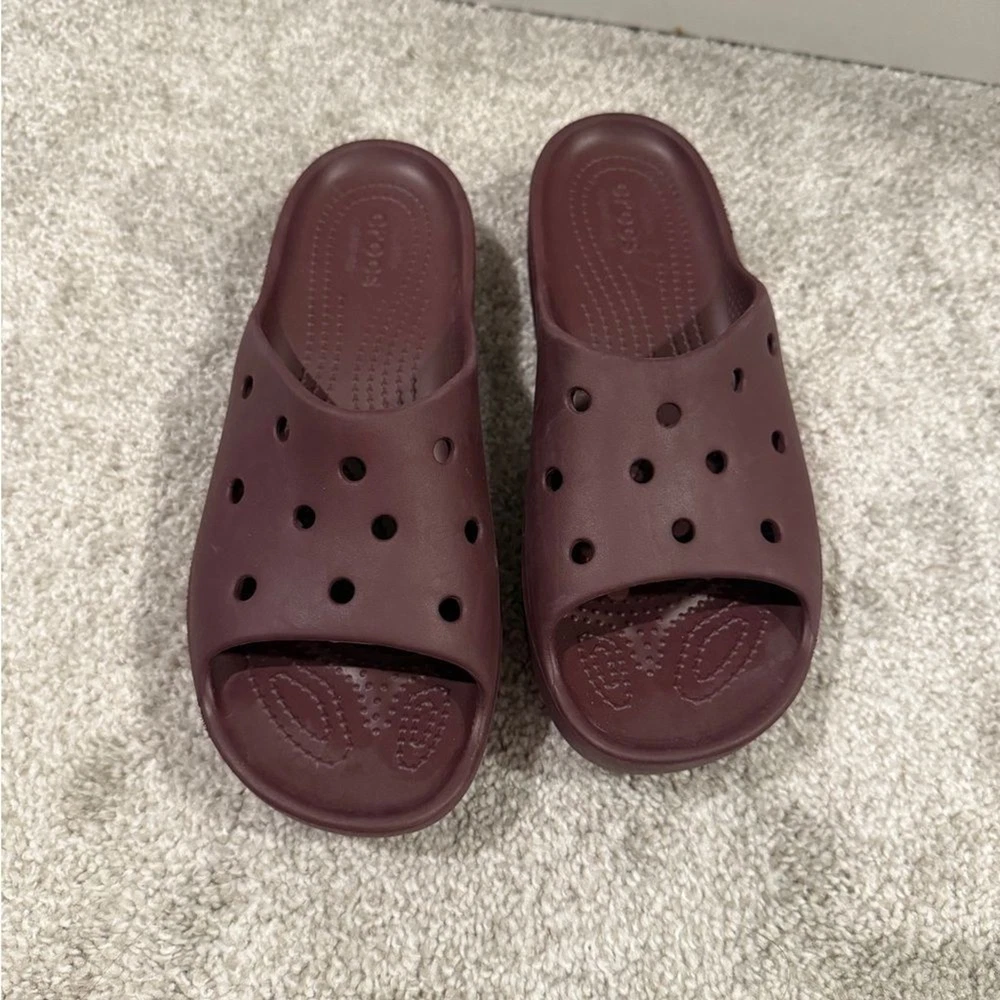 Crocs Size 8 Classic Platform? Open Round Toe Slide Slippers in Dark Cherry Please see all pics for wear and condition Overall good used condition with no major flaws Open to offers Smoke free environment Be sure to follow new items posted daily Major discount applied when bundling Ships from Seattle, WA