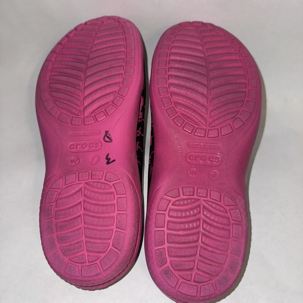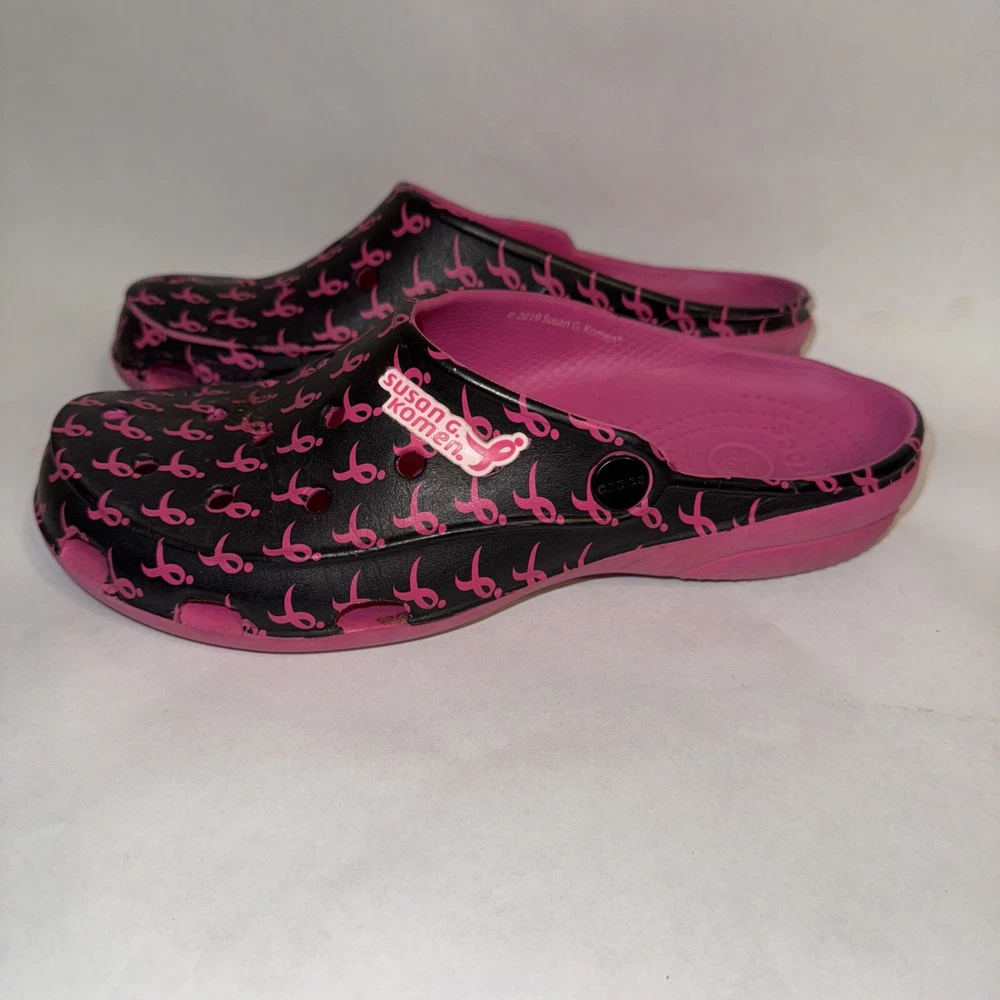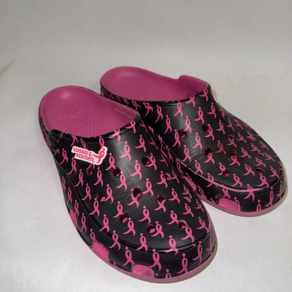 This Crocs mule shoe is a pre-owned women's size 7 in a pink and black color scheme with a Breast Cancer Awareness design. The shoe features a closed toe, slip-on style, and a relaxed fit, making it ideal for travel, casual wear, and work. It has a flat heel, lightweight construction, and is water-friendly with non-marking soles. The shoe is part of the Crocs freesail Susan G. Komen collection, offering comfort and breathability for activities like walking, beach outings, and school.