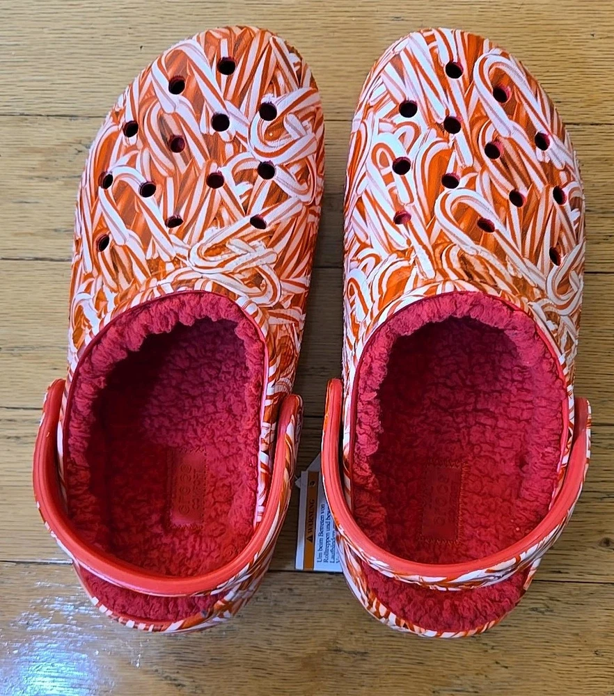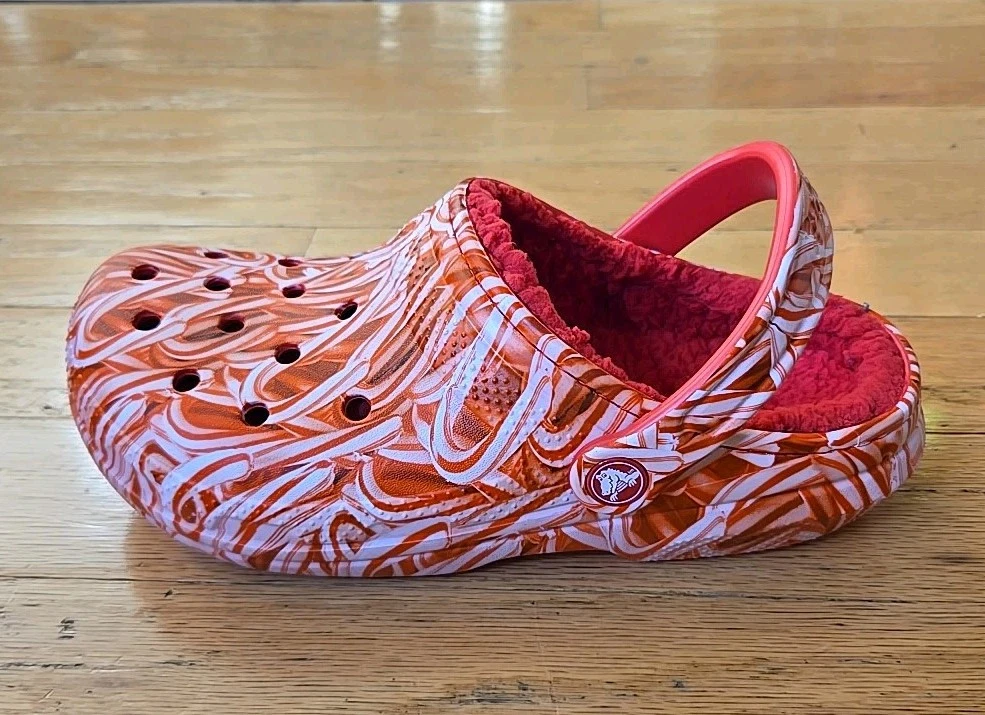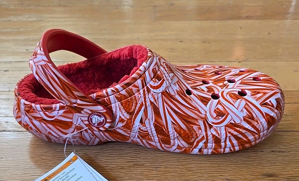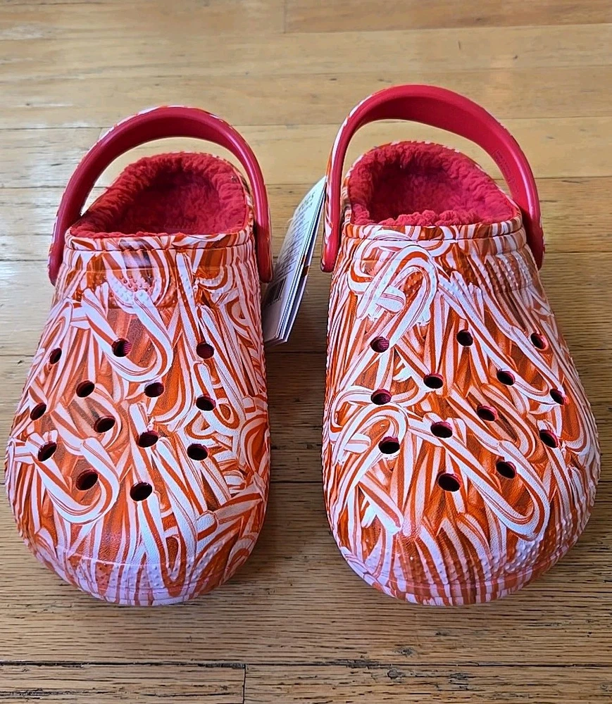 Elevate your comfort and style with these festive Crocs Classic Lined Candy Cane Clogs. Perfect for both women and men, the size 7W / 5M clogs feature a playful candy cane pattern in red and white, making them a great addition to your Christmas attire. The synthetic upper material and lining ensure a comfortable fit, while the almond toe shape and flat heel style provide a smooth and stable stride. These slip-on sandals are versatile and suitable for various occasions, including travel, activewear, casual outings, and workwear. The synthetic outsole material offers durability, and the standard shoe width adds to the overall comfort. Whether you're walking on the beach, going to school, or just lounging around, these Crocs Candy Cane clogs are a perfect choice for a stylish and comfortable footwear option.