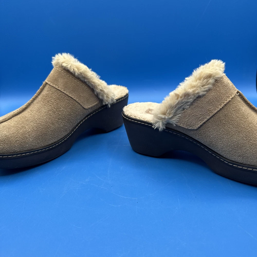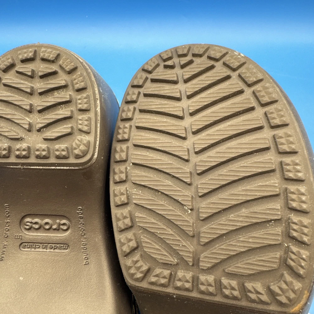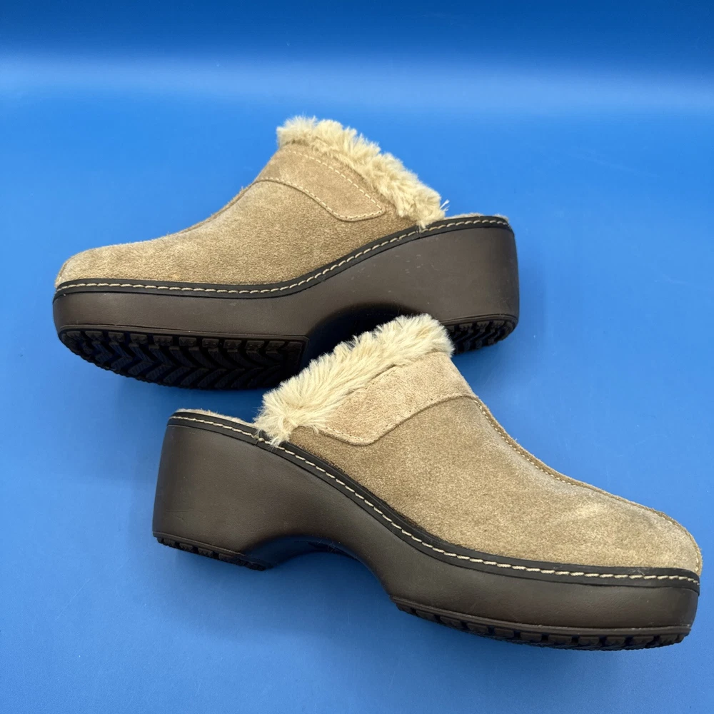 These Crocs Women's mule clogs are designed in brown suede with a faux fur lining for added comfort. They are slip-on style shoes with a faux suede outsole, perfect for casual wear. The size is women's 7, making them suitable for everyday use. Pre owned. Hardly used. No original box. Excellent condition. Size 7W. Please check the pictures carefully as part of the description. Feel free to ask questions if you need more information before you buy it. Thank you for your interest B-11