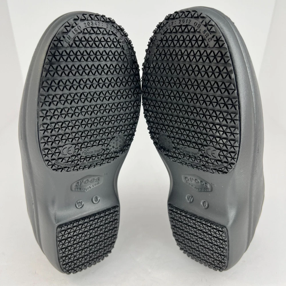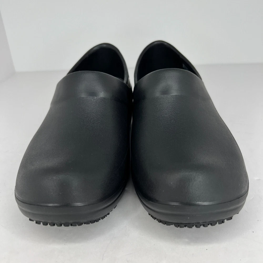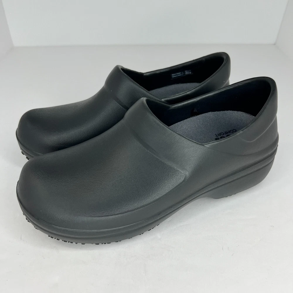Elevate your workwear with these stylish Crocs Neria Pro II slip-resistant slip-on clogs. The black rubber upper and closed-toe design provide both durability and safety, while the slip-resistant outsole ensures you stay comfortable and secure in slippery work environments. The low wedge heel and M shoe width make these clogs perfect for all-day wear, whether you're on your feet or walking around the office. These women's clogs feature a solid pattern and a product line of Crocs Neria. They are available in UK shoe size 3.5, US shoe size 6, and EU shoe size 36. The insole is also made of rubber, providing added comfort and support. Ideal for summer, fall, and spring, these slip-on clogs are the perfect addition to any work wardrobe. 100% CUSTOMER SATISFACTION IS OUR GOAL! Our items are always carefully examined for condition, measured if necessary, and photographed in a climate controlled and smoke-free environment. We make every attempt to accurately describe and clearly picture the items we have for sale. Please, ALWAYS view all of the photos. We value your business and our goal is your complete satisfaction. FAST SHIPPING All items are packaged with care and shipped out the same or next business day via USPS, FEDEX, or UPS with tracking numbers so you are always informed. RETURNS We offer a 30-day return policy. All items must be unused and unopened in the condition in which they were received, with original packaging, and all accessories included for return. REVIEWS - CUSTOMER SATISFACTION - COMMUNICATION We aim to make you happy. After you receive your shipment, please leave a positive review . If you have concerns or questions about your order, please contact us so we can resolve the issue. We will do our best to make you satisfied. THANK YOU FOR YOUR BUSINESS!