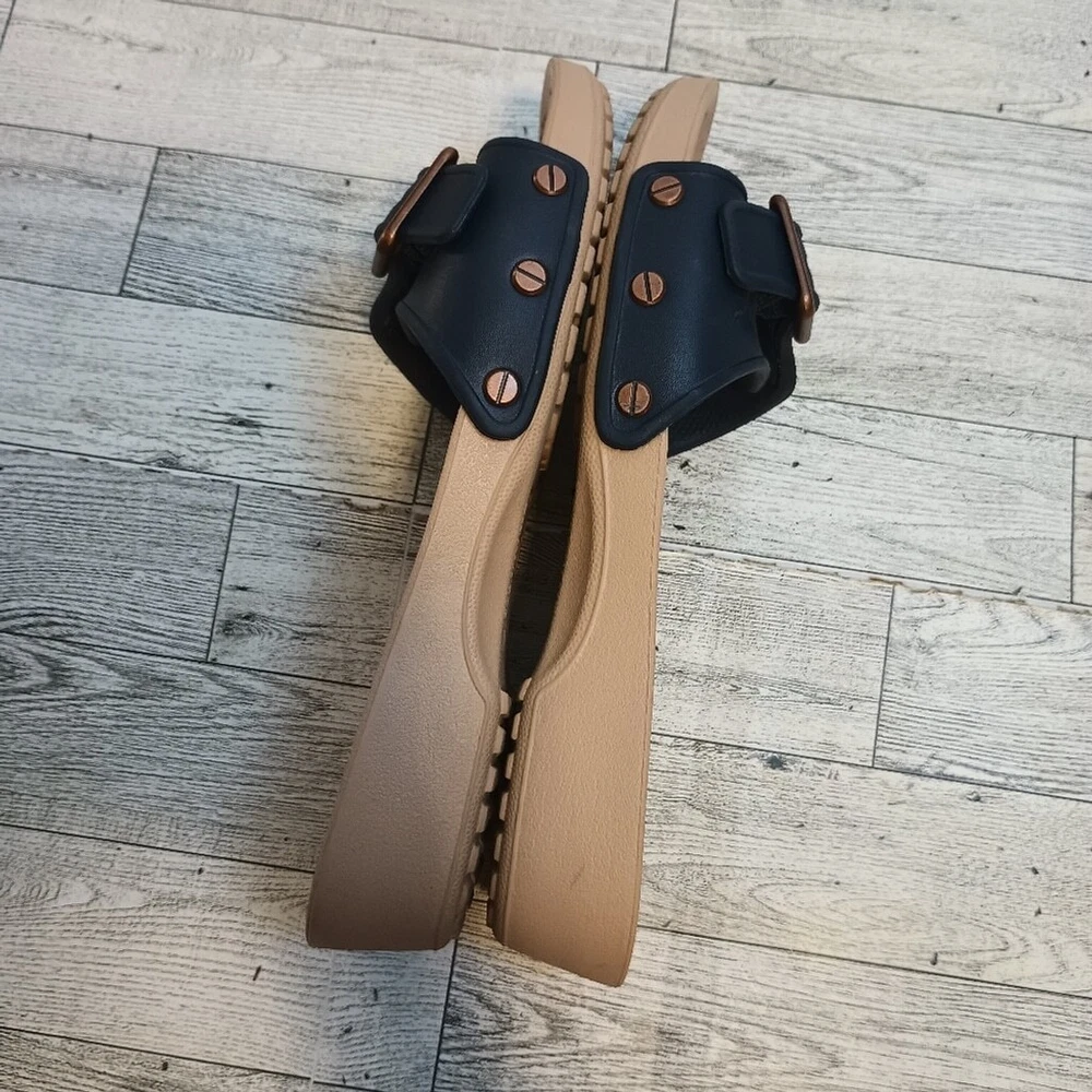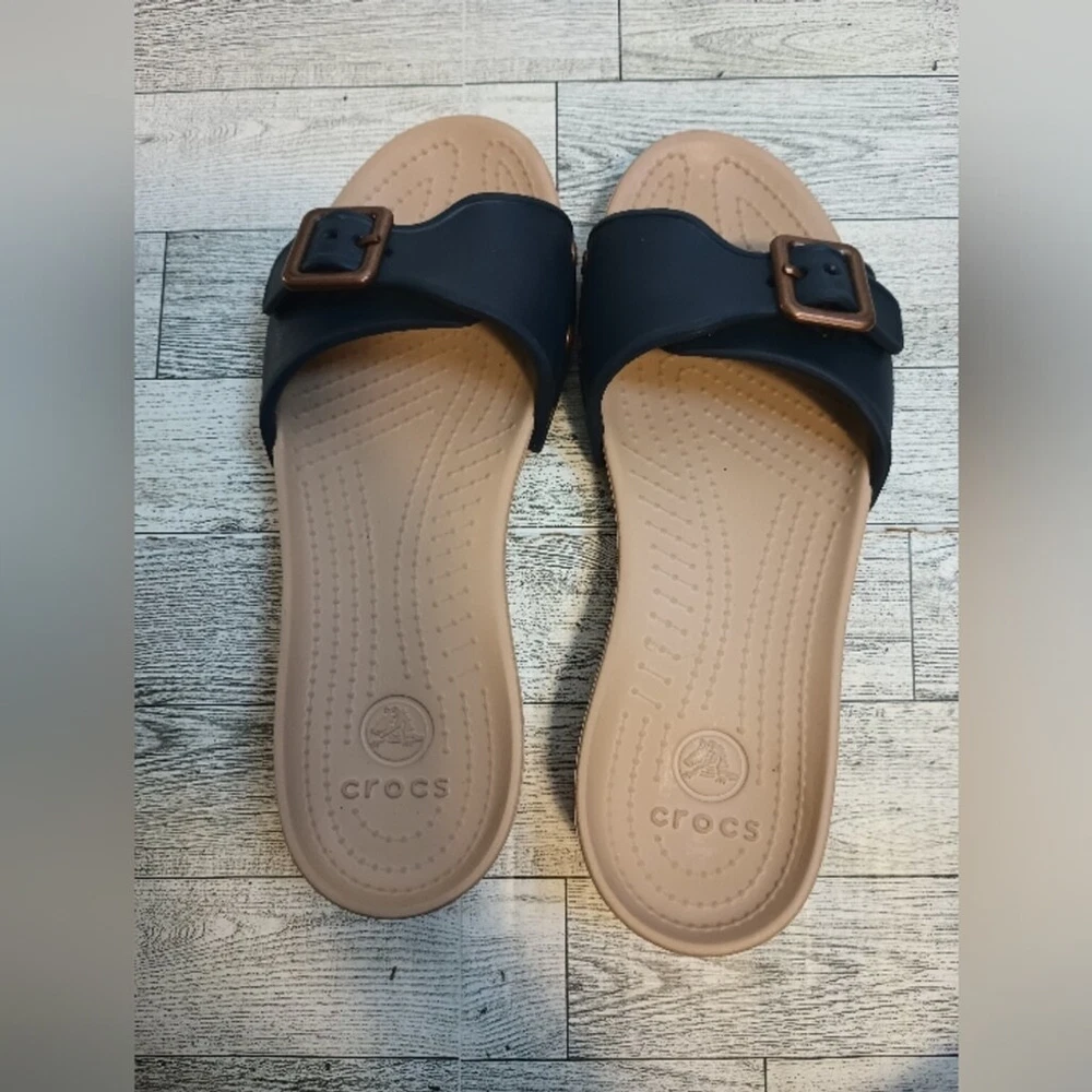 Crocs Women's Size 8 Sarah Buckle Slip On Comfort Sandals Blue Copper adjustable buckle for comfort cushioned comfort fit Great Used Condition ( see photos for details)Flaws: no holes, stains, or tears Please see photos for measurements in inches Washing instructions: see photos if instructions are available Non smoking home Vintage clothing comes with a history and I do my best to inspect for all flaws but I might miss tiny snags or holes. see photos of any flaws if found. Fast shipping! We are happy to answer your questions summer, casual everyday boho bohemian beach, vacation resort waterproof