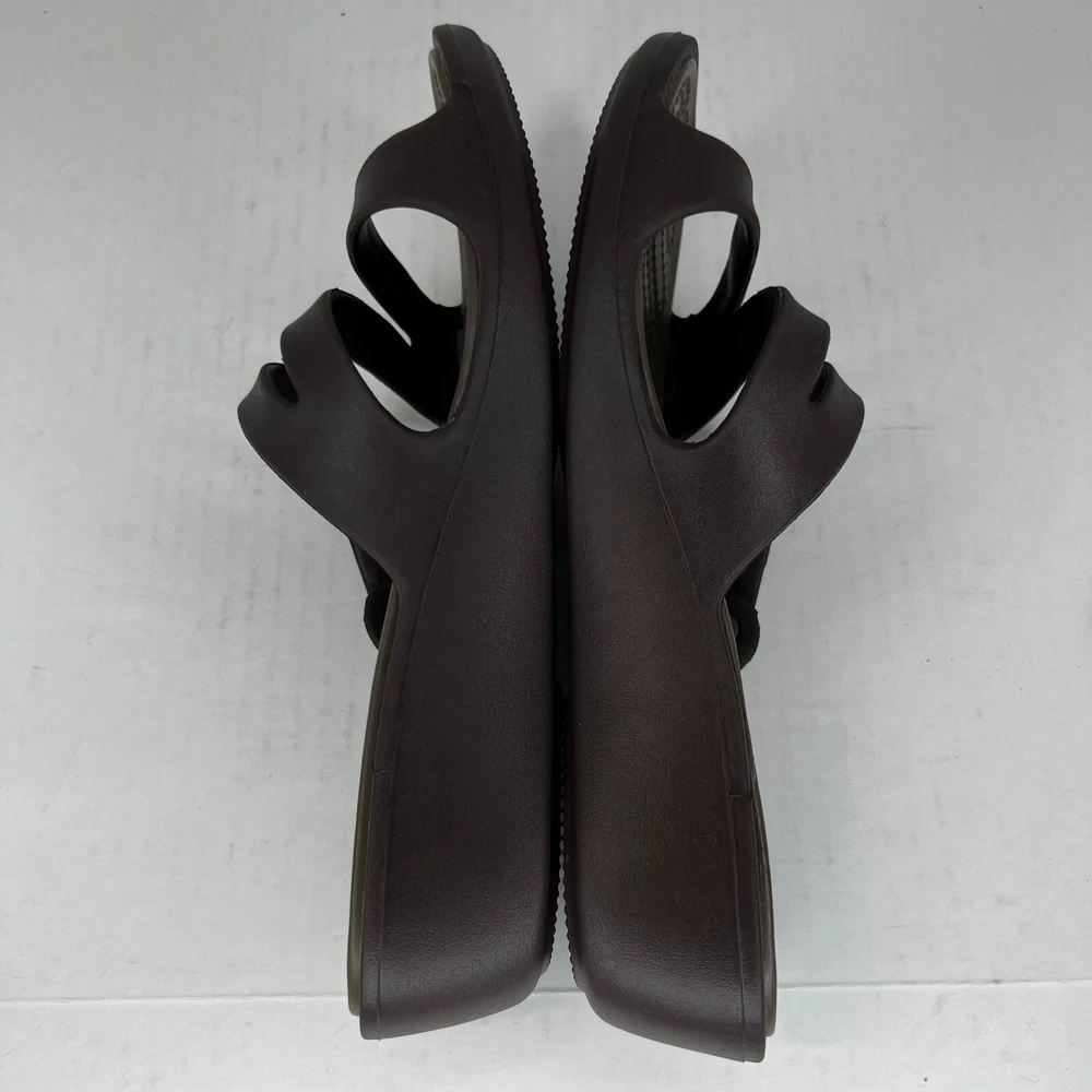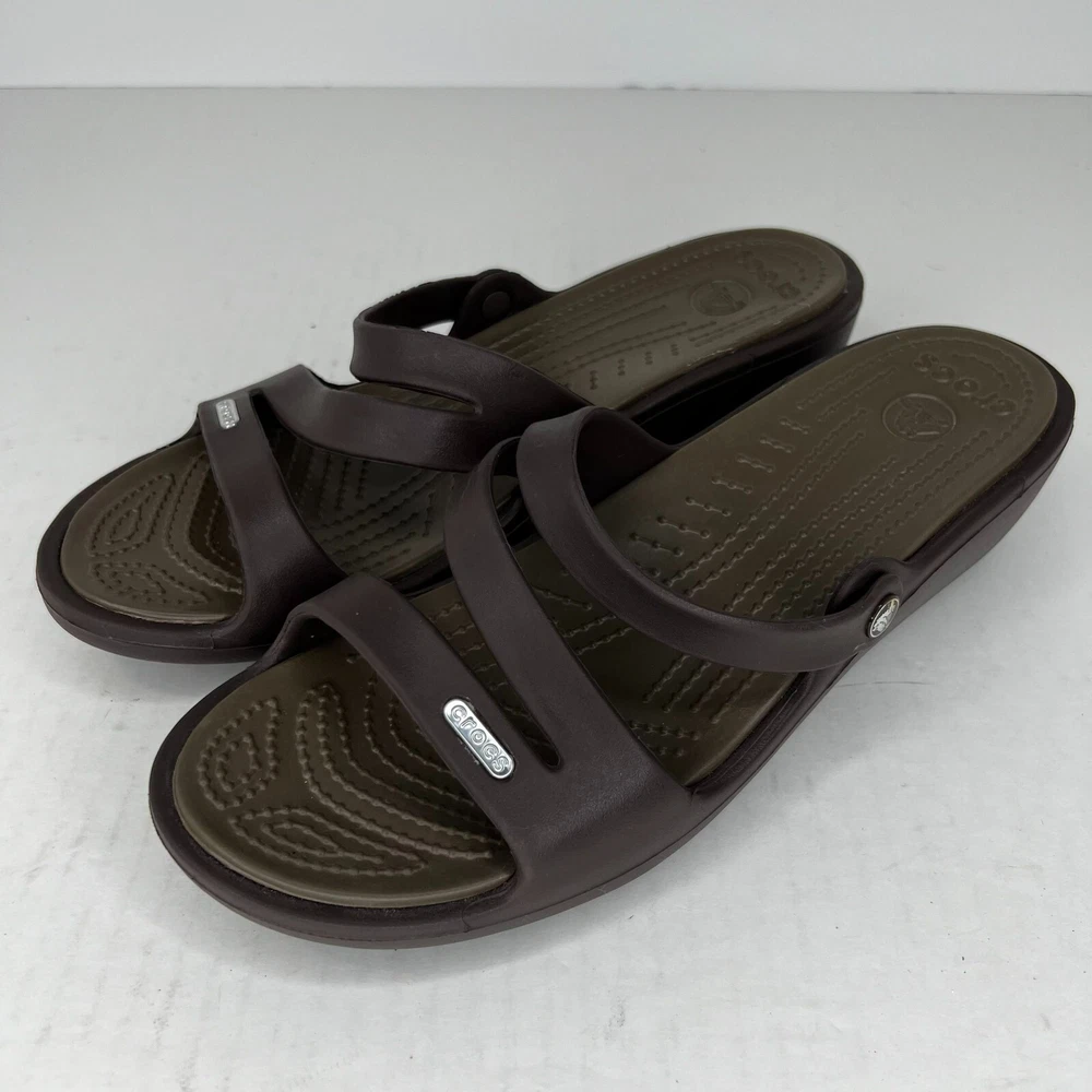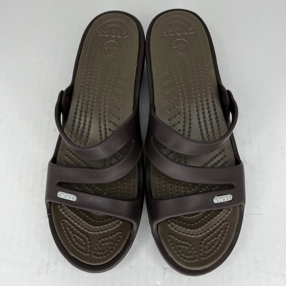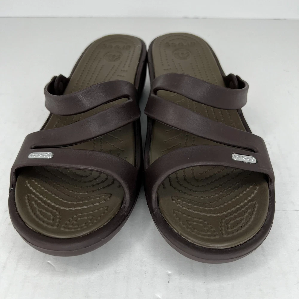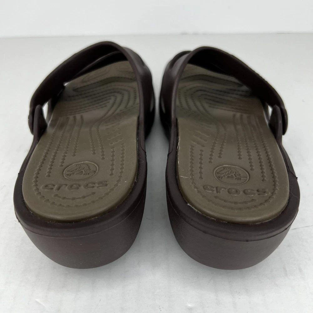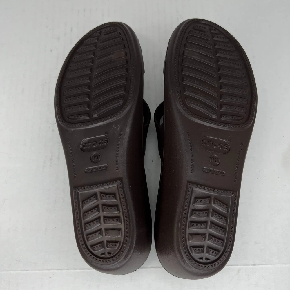 Step out in style with these fashionable brown strappy sandals from Crocs. Perfect for summer, fall or spring, these slip-on flats are made of high-quality rubber and come in a UK shoe size of 8, a US shoe size of 10 and EU shoe size of 42. The low heel height of 1-1.9 inches makes them comfortable for everyday wear and the rubber outsole material ensures durability. The Crocs Swiftwater model features a solid pattern with a beautiful accent strap that adds a touch of elegance to your outfit. Ideal for women, these sandals have a W shoe width and offer a personalized fit. Don't miss out on the opportunity to add these stylish sandals to your wardrobe. 100% CUSTOMER SATISFACTION IS OUR GOAL! Our items are always carefully examined for condition, measured if necessary, and photographed in a climate controlled and smoke-free environment. We make every attempt to accurately describe and clearly picture the items we have for sale. Please, ALWAYS view all of the photos. We value your business and our goal is your complete satisfaction. FAST SHIPPING All items are packaged with care and shipped out the same or next business day via USPS, FEDEX, or UPS with tracking numbers so you are always informed. RETURNS We offer a 30-day return policy. All items must be unused and unopened in the condition in which they were received, with original packaging, and all accessories included for return. REVIEWS - CUSTOMER SATISFACTION - COMMUNICATION We aim to make you happy. After you receive your shipment, please leave a positive review . If you have concerns or questions about your order, please contact us so we can resolve the issue. We will do our best to make you satisfied. THANK YOU FOR YOUR BUSINESS!
